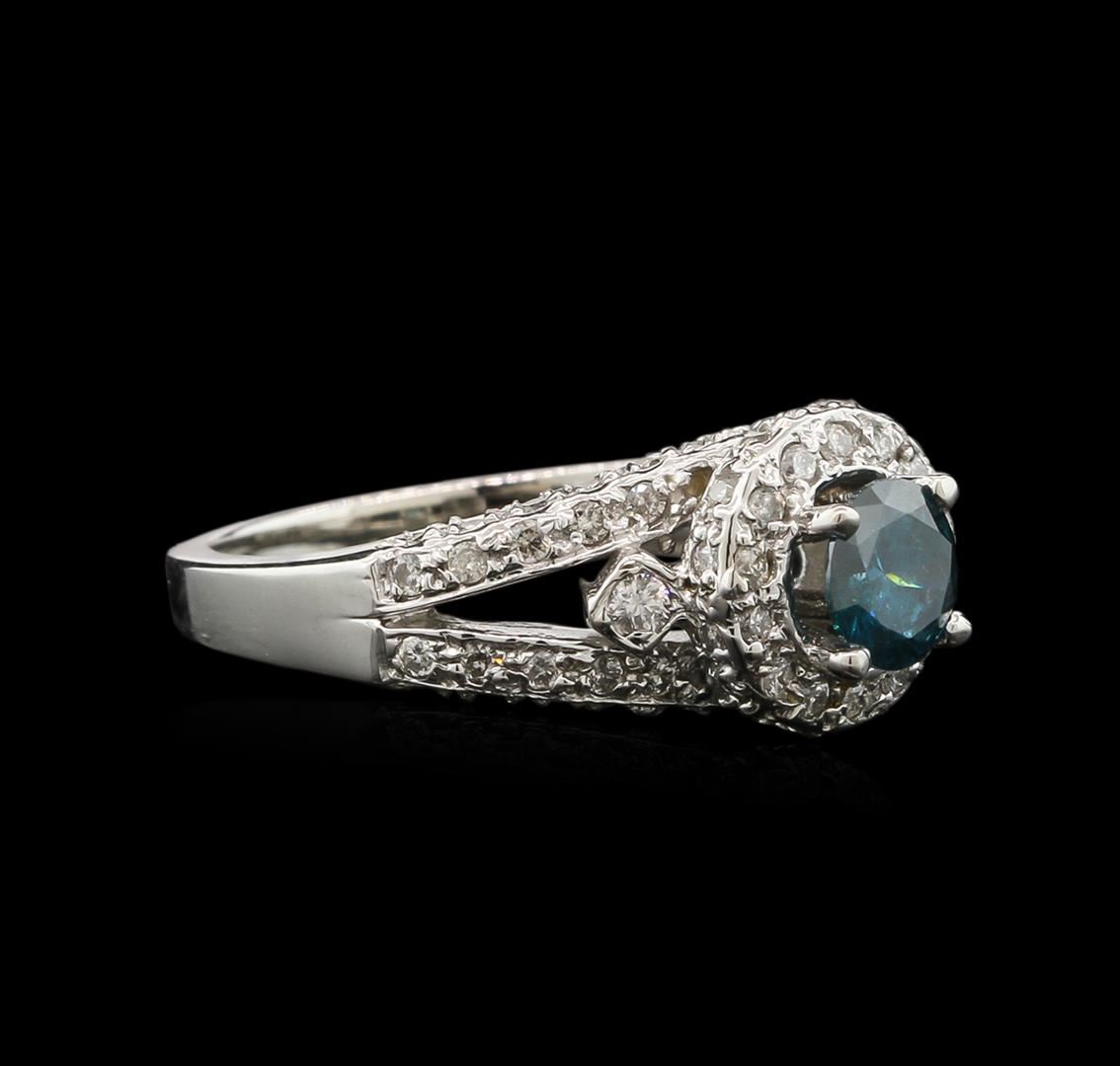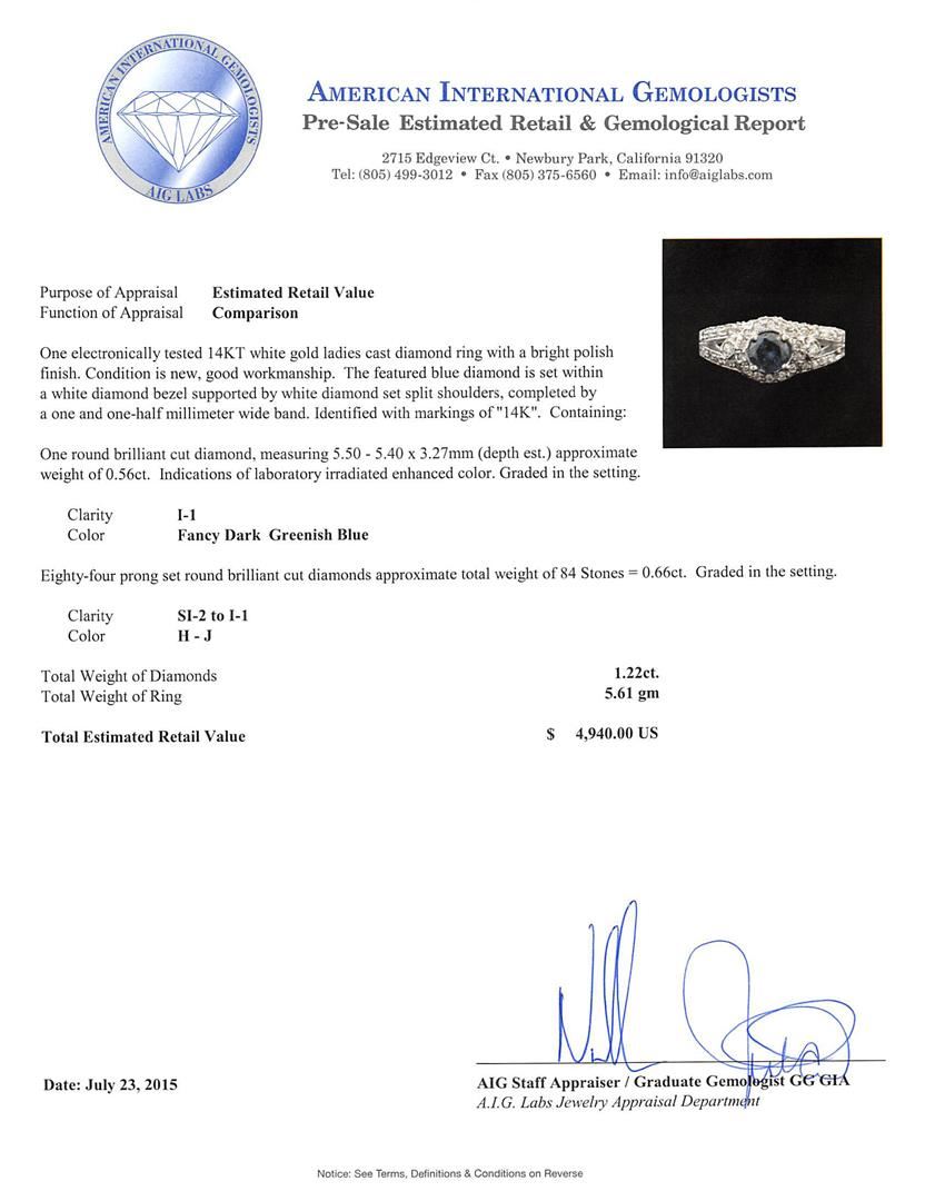 One electronically tested 14KT white gold ladies cast diamond ring with a bright polish finish. The featured blue diamond is set within a white diamond bezel supported by white diamond set split shoulders, completed by a one and one-half millimeter wide band. Identified with markings of "14K". Condition is new, good workmanship. Containing: One round brilliant cut diamond, measuring 5.50 - 5.40 x 3.27mm (depth est.) approximate weight of 0.56ct. Indications of laboratory irradiated enhanced color. Graded in the setting. Clarity: I-1 Eighty-Four prong set round brilliant cut diamonds approximate. Total Weight of 84 Stones = 0.66ct. Graded in the setting. Clarity: SI-2 to I-1. Color: H - J. Total Weight of Diamonds 1.22ct. Total Weight of Ring 5.61gm. AIG Appraised at $4,940.00.