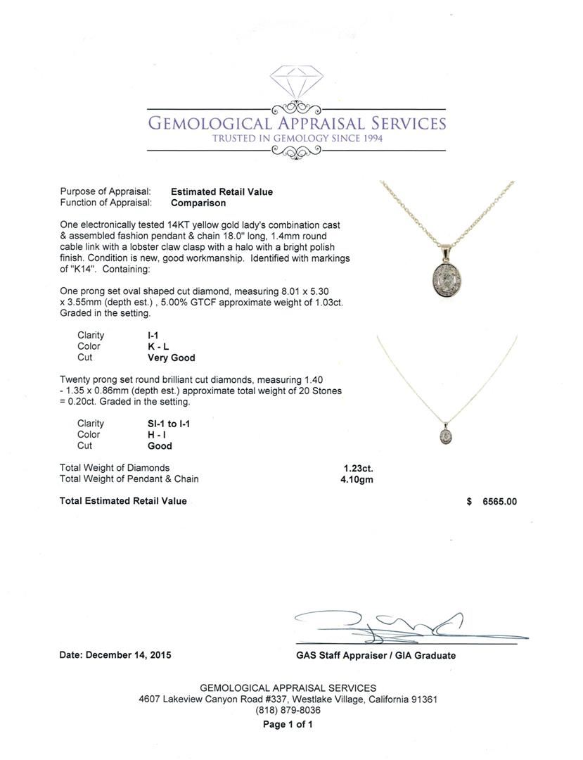 One electronically tested 14KT yellow gold lady's combination cast & assembled fashion pendant & chain 18.0" long, 1.4mm round cable link with a lobster claw clasp with a halo with a bright polish finish. Identified with markings of "K14". Condition is new, good workmanship. Containing: One prong set oval shaped cut diamond, measuring 8.01 x 5.30 x 3.55mm (depth est.) , 5.00.%. GTCF approximate weight of 1.03ct. Graded in the setting. Clarity: I-1. Color: K - L. Cut Very Good Twenty prong set round brilliant cut diamonds, measuring 1.40 - 1.35 x 0.86mm (depth est.) approximate total weight of 20 Stones = 0.20ct. Graded in the setting. Clarity: SI-1 to I-1. Color: H - I. Cut Good. Total Weight of Diamonds 1.23ct. Total Weight of Pendant & Chain 4.10gm. GAS Appraised at $6,565.00.
