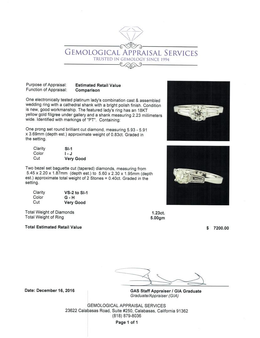 One electronically tested platinum lady's combination cast & assembled wedding ring with a cathedral shank with a bright polish finish. The featured lady's ring has an 18KT yellow gold filigree under gallery and a shank measuring 2.23 millimeters wide. Identified with markings of 'PT'. Condition is new, good workmanship. Containing: One prong set round brilliant cut diamond, measuring 5.93 - 5.91 x 3.69mm (depth est.) approximate weight of 0.83ct. Graded in the setting. Clarity SI-1. Color: I - J Cut Very Good Two bezel set baguette cut (tapered) diamonds, measuring from 5.45 x 2.20 x 1.87mm (depth est.) to 5.60 x 2.30 x 1.95mm (depth est.) approximate total weight of 2 Stones = 0.40ct. Graded in the setting. Clarity VS-2 to SI-1. Color: G - H Cut Very Good. Total Weight of Diamonds 1.23ct.. Total Weight of Ring 5.00gm. GAS Appraised at $7,200.00.