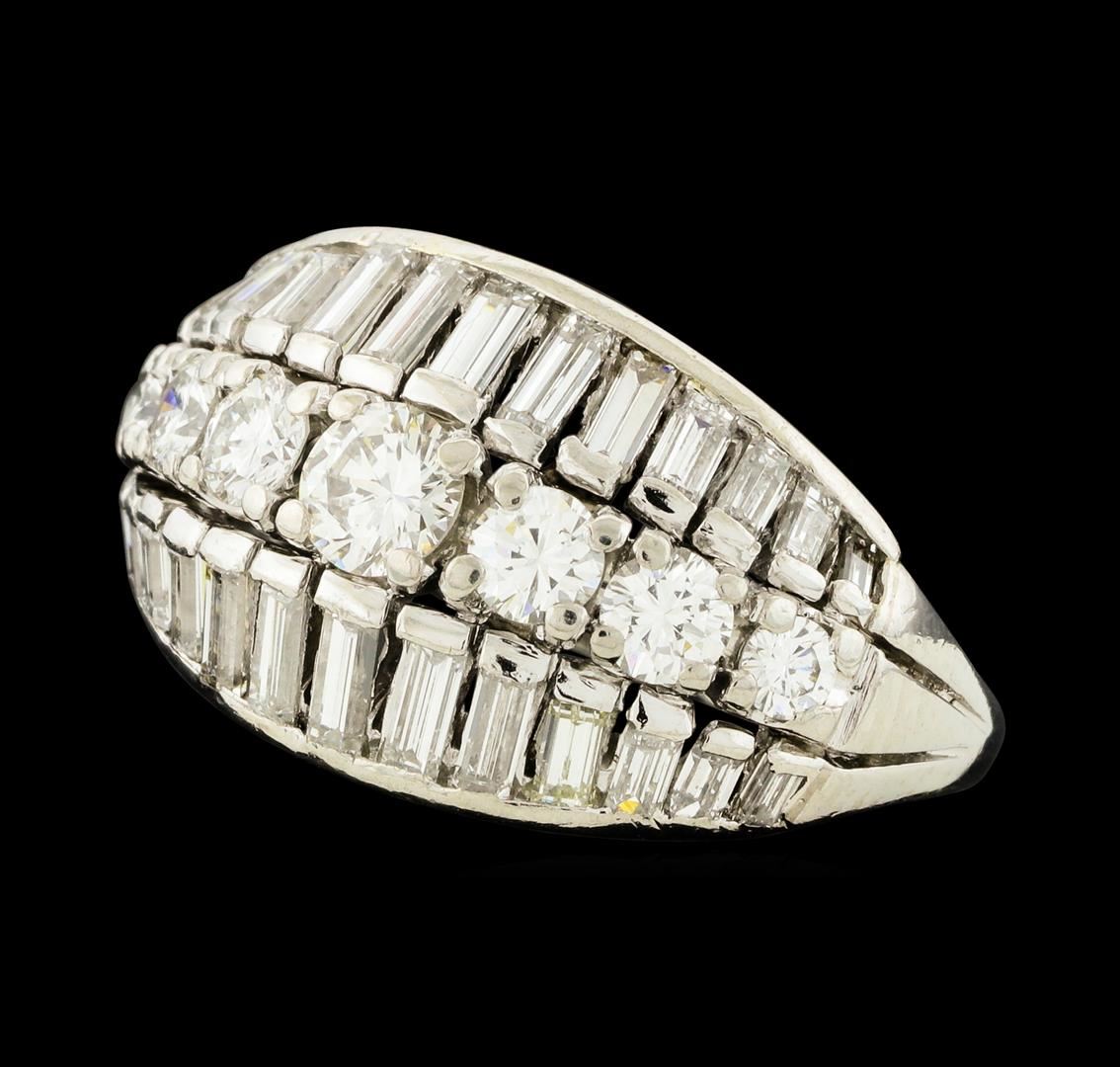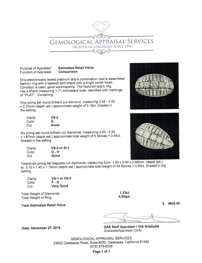 One electronically tested platinum lady's combination cast & assembled fashion ring with a tapered split shank with a bright polish finish. The featured lady's ring has a shank measuring 1.71 millimeters wide. Identified with markings of 'PLAT'. Condition is used, good workmanship. Containing: One prong set round brilliant cut diamond, measuring 3.58 - 3.55 x 2.23mm (depth est.) approximate weight of 0.18ct. Graded in the setting. Clarity VS-2. Color: G Cut Good Six prong set round brilliant cut diamonds, measuring 2.90 - 2.50 x 1.67mm (depth est.) approximate total weight of 6 Stones = 0.45ct. Graded in the setting. Clarity VS-2 to SI-1. Color: G - H Cut Good Twenty-Six prong set baguette cut diamonds, measuring from 1.80 x 0.80 x 0.68mm (depth est.) to 3.10 x 1.40 x 1.19mm (depth est.) approximate total weight of 26 Stones = 0.60ct. Graded in the setting. Clarity VS-1 to VS-2. Color: F - G Cut Very Good. Total Weight of Diamonds 1.23ct.. Total Weight of Ring 6.80gm. GAS Appraised.