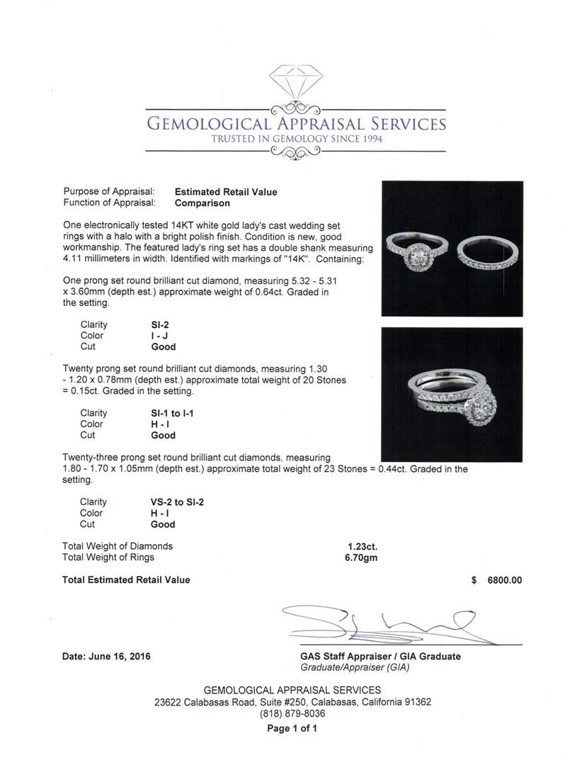 One electronically tested 14KT white gold lady's cast wedding set rings with a halo with a bright polish finish. The featured lady's ring set has a double shank measuring 4.11 millimeters in width. Identified with markings of "14K". Condition is new, good workmanship. Containing: One prong set round brilliant cut diamond, measuring 5.32 - 5.31 x 3.60mm (depth est.) approximate weight of 0.64ct. Graded in the setting. Clarity: SI-2. Color: I - Good Twenty prong set round brilliant cut diamonds, measuring 1.30 - 1.20 x 0.78mm (depth est.) approximate total weight of 20 Stones = 0.15ct. Graded in the setting. Clarity: SI-1 to I-1. Color: H - I. Cut Good Twenty-Three prong set round brilliant cut diamonds, measuring 1.80 - 1.70 x 1.05mm (depth est.) approximate total weight of 23 Stones = 0.44ct. Graded in the setting. Clarity: VS-2 to SI-2. Color: H - I. Cut Good. Total Weight of Diamonds 1.23ct. Total Weight of Rings 6.70gm GAS Appraised.
