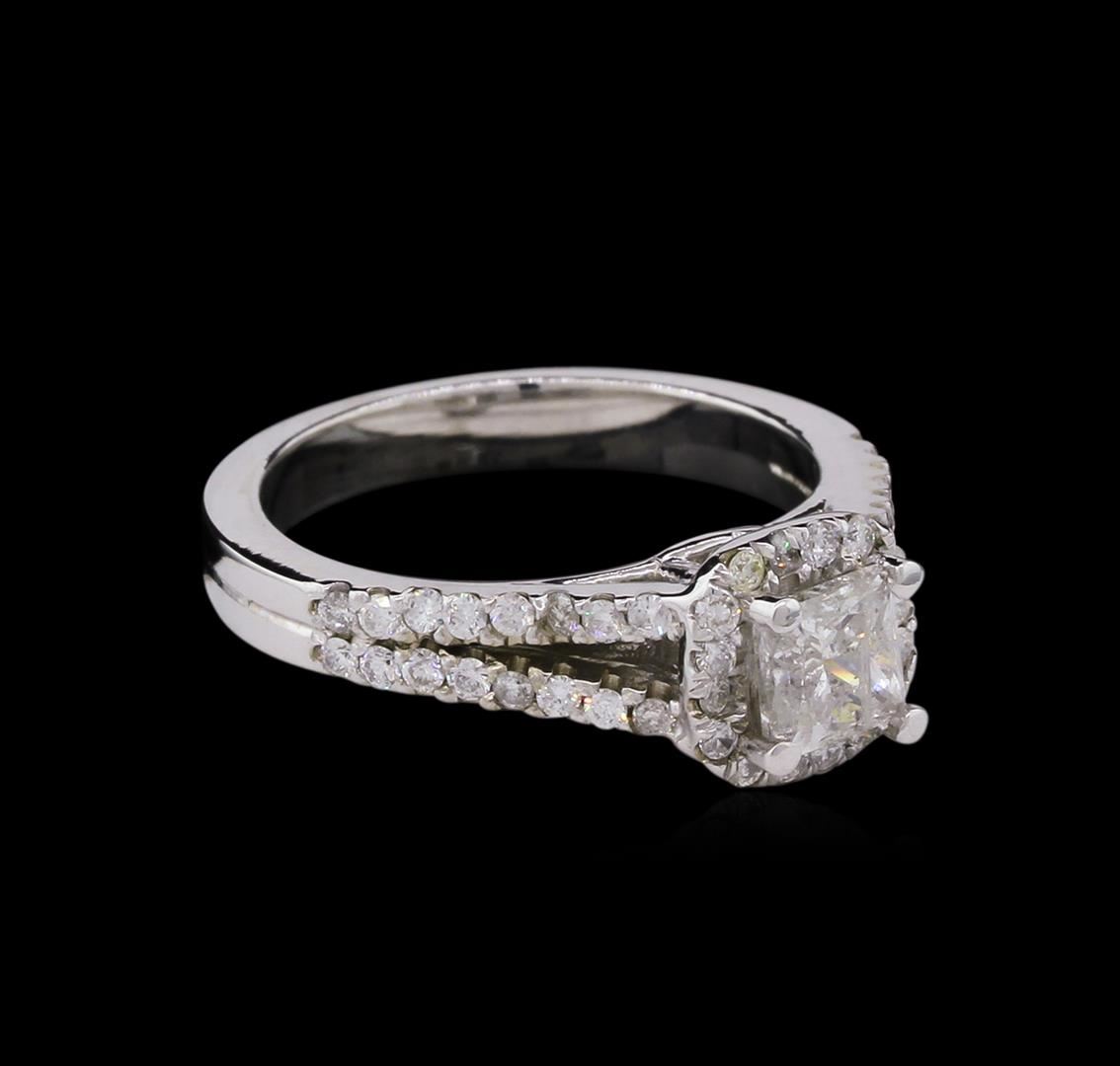 One electronically tested 14KT white gold lady's cast wedding ring with a split shank with a bright polish finish. The featured lady's ring has a shank measuring 3.02 millimeters wide. Identified with markings of "14K". Condition is new, good workmanship. Containing: One prong set princess cut diamond, measuring 4.74 x 4.65 x 3.51mm (depth est.) , 15.00%. GTCF approximate weight of 0.75ct. Graded in the setting. Clarity: I-1 . Color: J - K. Cut Good Forty-Eight prong set round brilliant cut diamonds, measuring 1.40 - 1.35 x 0.87mm (depth est.) approximate total weight of 48 Stones = 0.48ct. Graded in the setting. Clarity: SI-1 to SI-2 . Color: H - I. Cut Good. Total Weight of Diamonds 1.23ct.. Total Weight of Ring 5.00gm at $ 5250.00 GAS Appraised.