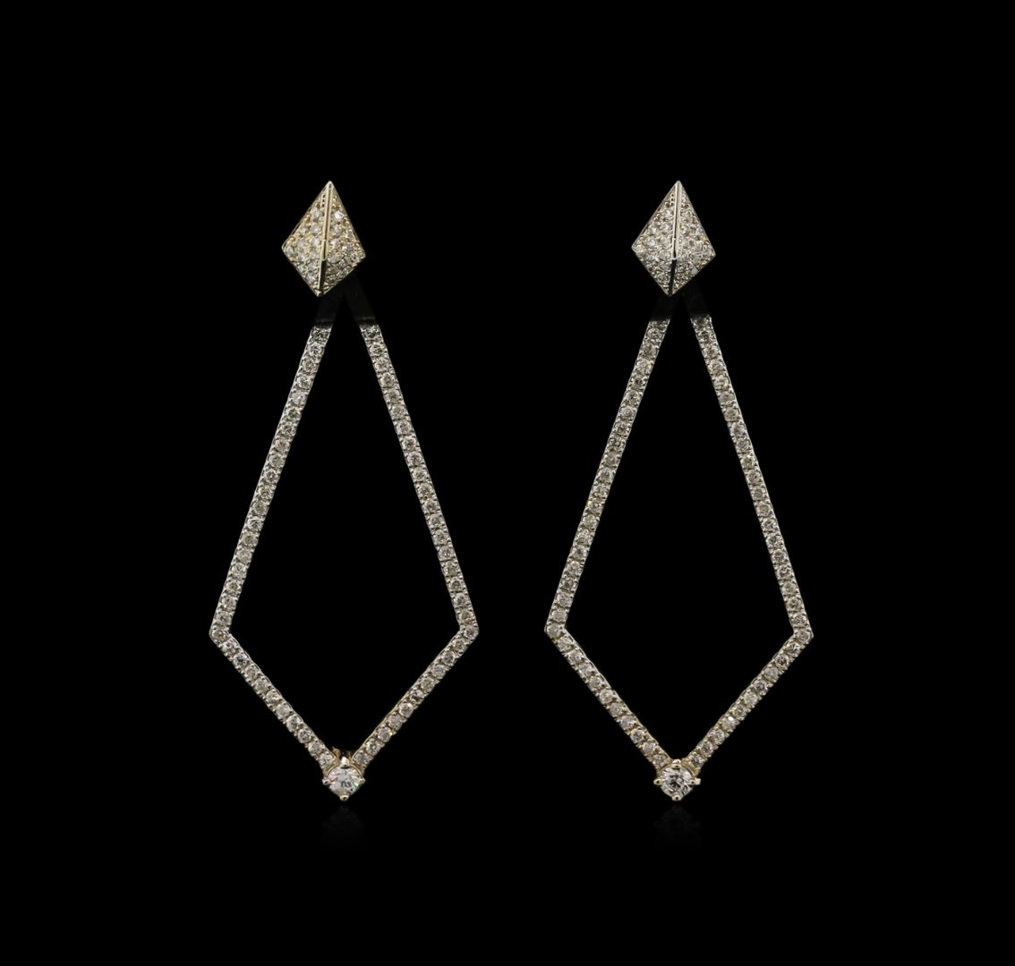 One pair electronically tested 14KT white gold lady's combination cast & assembled dangle earrings with heavy friction backs with a bright polish finish. Identified with markings of "14K". Condition is new, good workmanship. Containing: Two prong set round brilliant cut diamonds, measuring 2.80 - 2.70 x 1.65mm (depth est.) approximate total weight of 2 Stones = 0.15ct. Graded in the setting. Clarity: SI-2 to I-1. Color: I. Cut Good One Hundred Twenty-Four bead set round brilliant cut diamonds, measuring 1.30 - 1.20 x 0.78mm (depth est.) approximate total weight of 124 Stones = 0.92ct. Graded in the setting. Clarity: SI-2 to I-1. Color: H - J. Cut Good Forty-Four bead set round brilliant cut diamonds, measuring 1.00 - 0.95 x 0.63mm (depth est.) approximate total weight of 44 Stones = 0.16ct. Graded in the setting. Clarity: SI-2 to I-1. Color: H - I. Cut Good. Total Weight of Diamonds 1.23ct. Total Weight of Earrings 8.00gm. GAS Appraised at $5,285.00.