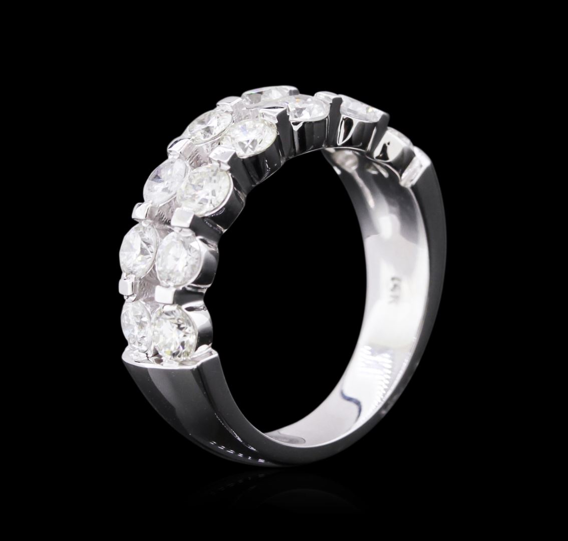 One electronically tested 14KT white gold ladies cast diamond ring with a bright polish finish. Identified with markings of "14K". Condition is new. Containing: Fourteen prong set round brilliant cut diamonds, measuring 3.20 - 3.20 x 1.92mm (depth est.) approximate total weight of 14 Stones = 1.23ct. Clarity: I-1 to I-2. Color: I - J, Cut is Good. Diamonds are graded in the mounting, unless otherwise stated. Total Weight of Diamonds 1.23ct. Total Weight of Ring 6.20 grams. GGL Appraised at $3,175.00.
