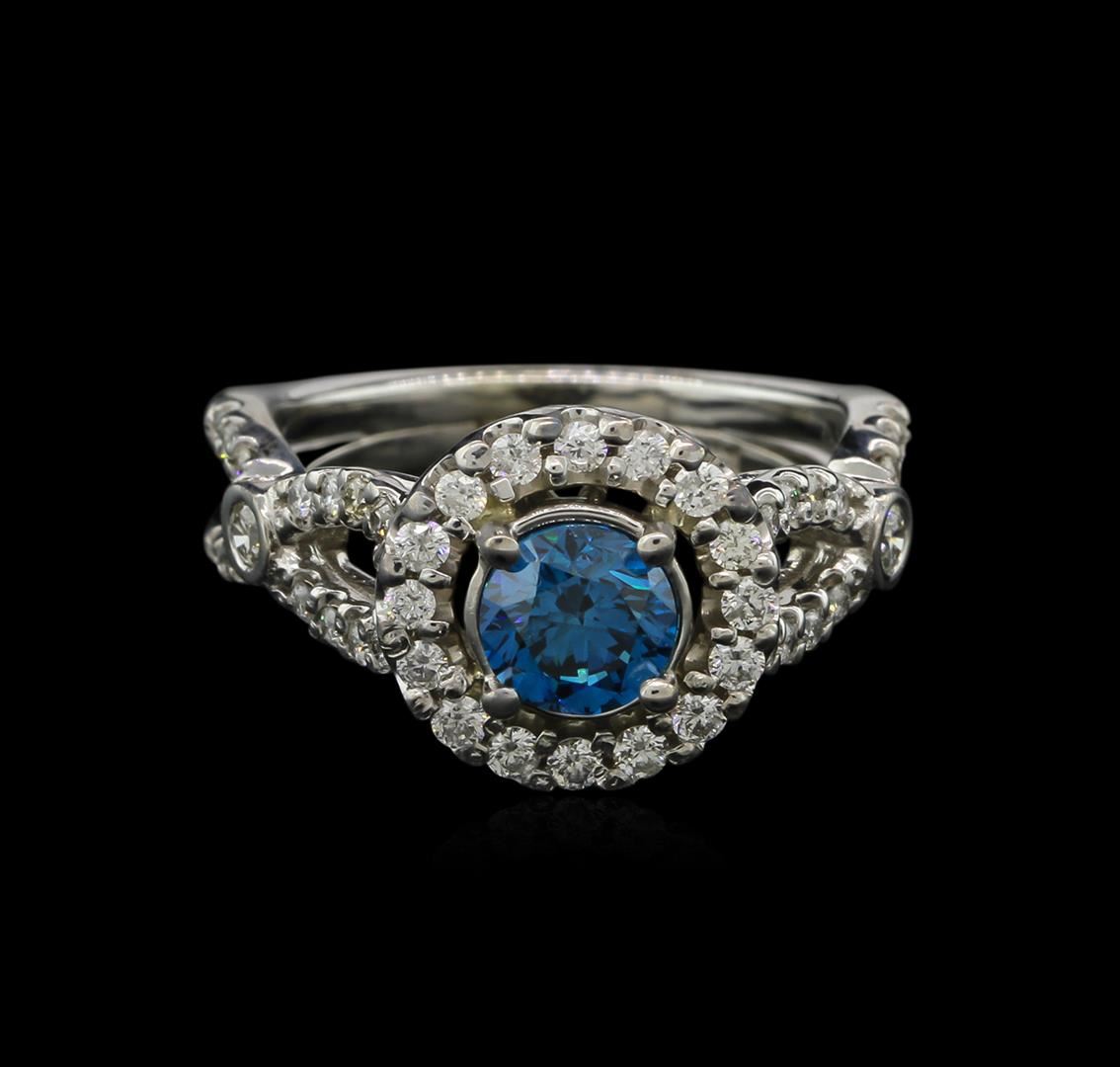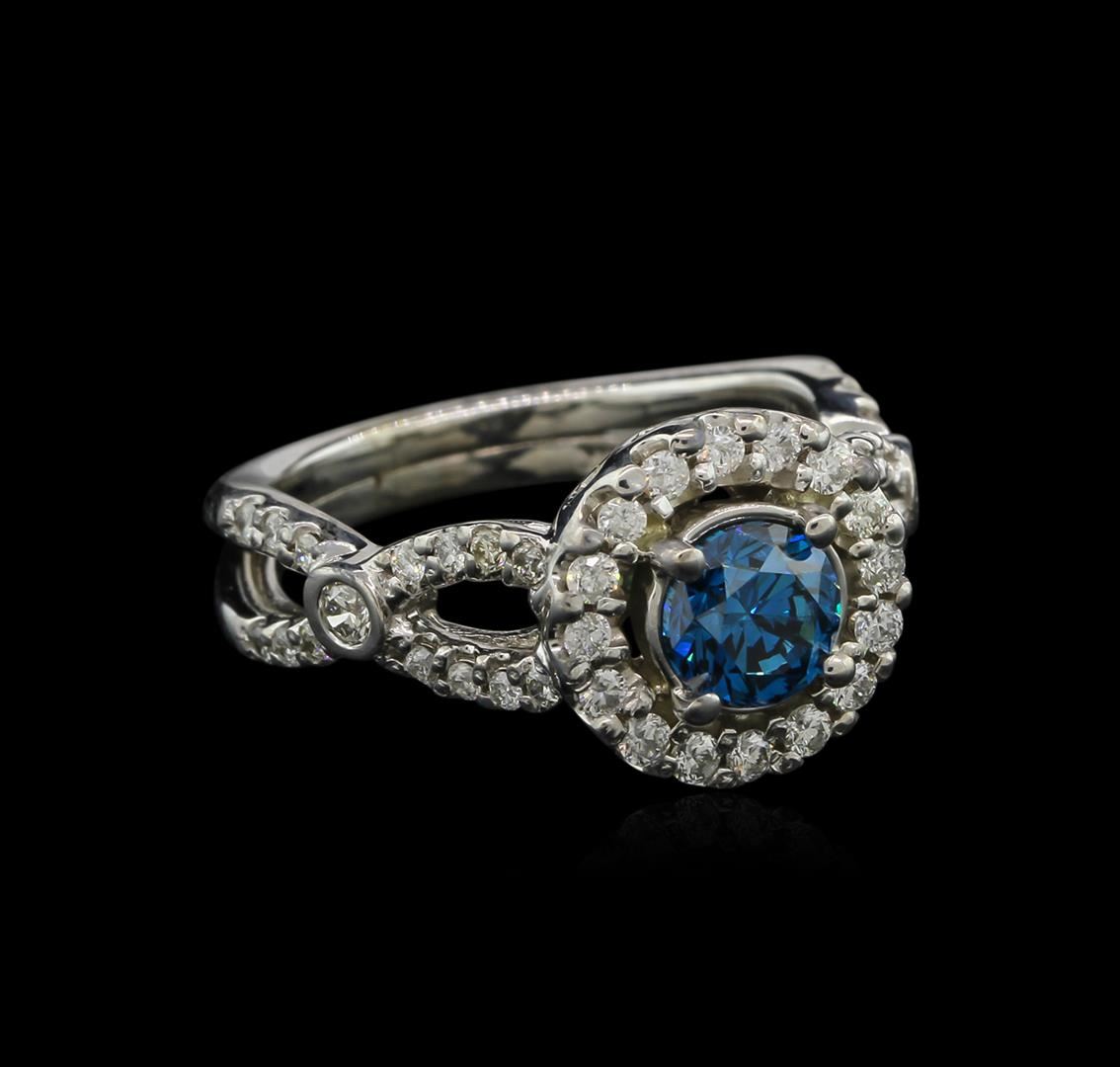 One electronically tested 14KT white gold ladies cast diamond ring with a bright polish finish. The featured diamond is set within a diamond bezel supported by diamond set intertwining shoulders, completed by a grooved two and one-half millimeter wide band. Identified with markings of "14K". Condition is new, good workmanship. Containing: One prong set round brilliant cut diamond, measuring 5.55 - 5.50 x 3.32mm (depth est.) approximate weight of 0.73ct. Indications of laboratory irradiated enhanced color. Graded in the setting. Clarity I-1 Depth 60.0%. Table 59.7%. Forty-Six prong & bezel set round brilliant cut diamonds approximate total weight of 46 Stones = 0.50ct. Graded in the setting. Clarity SI-2 to I-1 Color G - I. Total Weight of Diamonds 1.23ct. Total Weight of Ring 5.66 grams. AIG Appraised at $4,990.00.
