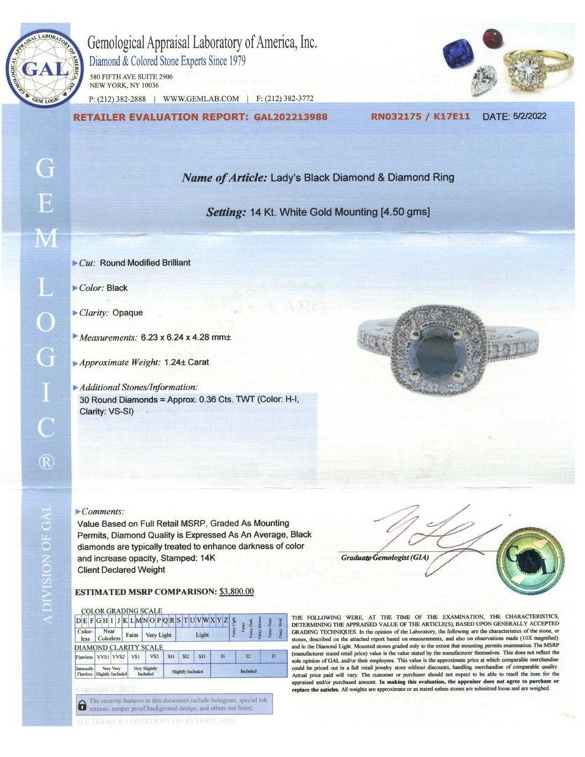 1.24ct CENTER Black Diamond 14K White Gold Ring (1.60ctw Diamonds). Lady's Black Diamond & Diamond Ring Setting: 14 Kt. White Gold Mounting [4.50 gms] Cut: Round Modified Brilliant Color: Black Clarity: Opaque Measurements: 6.23 x 6.24 x 4.28mm Approximate Weight: 1.24 Carat *Additional Stones/information* 30 Round Diamonds = Approx. 0.36 Cts. TWT (Color: H-I, Clarity: VS-SI) *Comments* Value Based on Full Retail MSRP, Graded As Mounting Permits, Diamond Quality is Expressed As An Average, Black diamonds are typically treated to enhance darkness of color , and increase opacity, Stamped: 14K