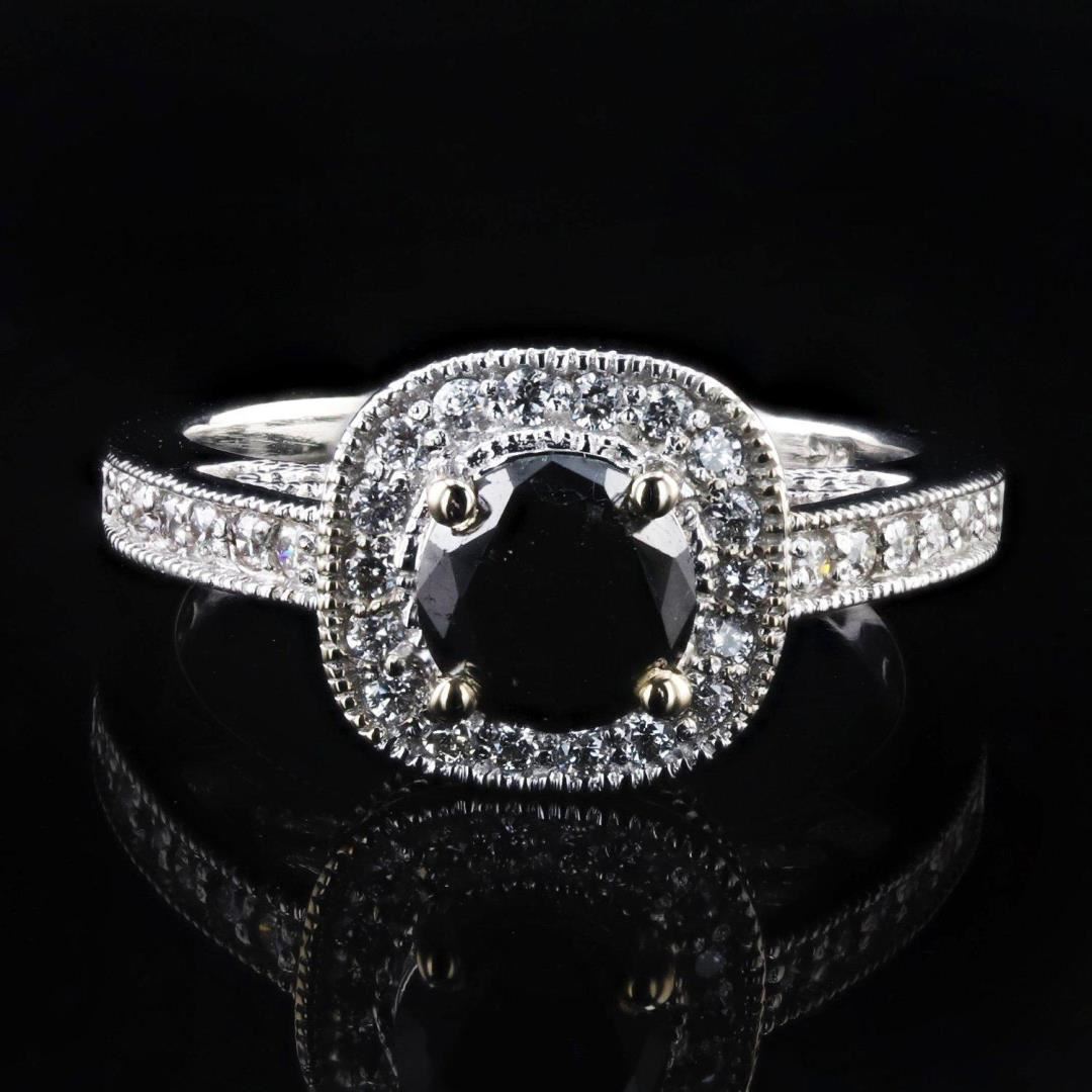 Lady's Black Diamond & Diamond Ring Setting: 14 Kt. White Gold Mounting [4.50 gms] Cut: Round Modified Brilliant Color: Black Clarity: Opaque Measurements: 6.23 x 6.24 x 4.28mm Approximate Weight: 1.24 Carat *Additional Stones/information* 30 Round Diamonds = Approx. 0.36 Cts. TWT (Color: H-I, Clarity: VS-SI) *Comments* Value Based on Full Retail MSRP, Graded As Mounting Permits, Diamond Quality is Expressed As An Average, Black diamonds are typically treated to enhance darkness of color , and increase opacity, Stamped: 14K Size: 6.5