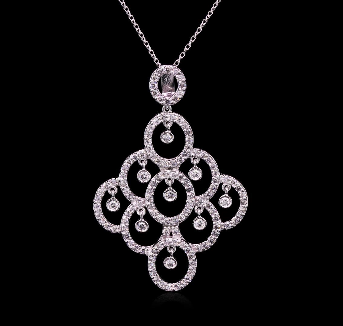 One electronically tested 14KT white gold ladies cast & assembled diamond pendant and chain. The pendant features a cluster of diamond set rings, each featuring a dangling round brilliant diamond, completed by a diamond set "O" shaped bail. The pendant is supported by an eighteen inch length designer style chain, terminating in a lobster claw clasp. Bright polish finish. Identified with markings of "14K". Condition is new, good workmanship. Containing: One Hundred Twenty-Seven prong & bezel set round brilliant cut diamonds, measuring 1.70 - 1.40 x 0.93mm exact total weight 127 Stones = 1.24ct. Graded in the setting. Clarity: SI-1 to I-2. Color: G - H. Total Weight of Diamonds 1.24ct. Total Weight of Pendant And Chain 6.16gm. AIG Appraised at $4,655.00.