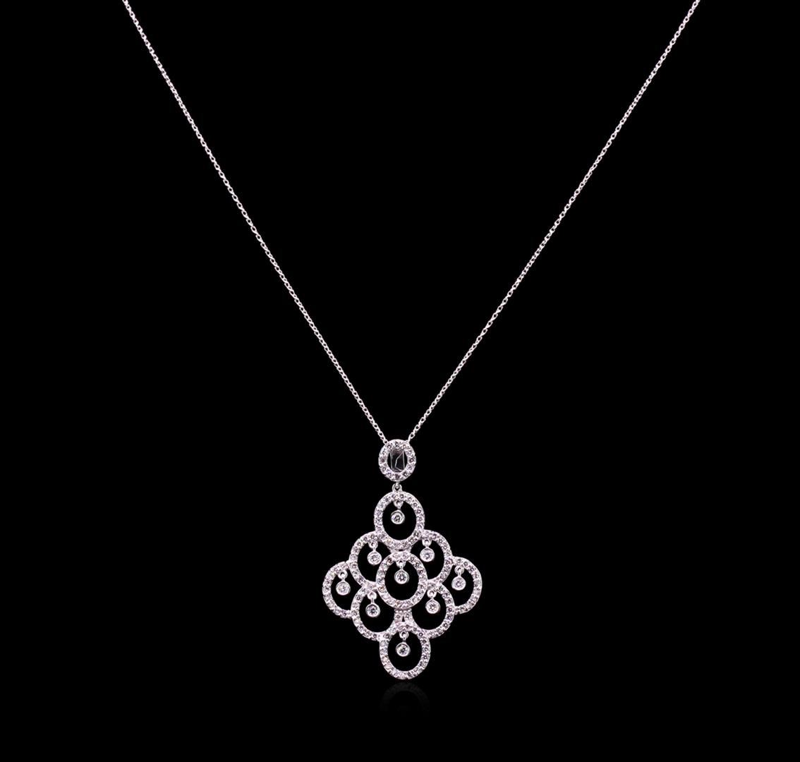 One electronically tested 14KT white gold ladies cast & assembled diamond pendant and chain. The pendant features a cluster of diamond set rings, each featuring a dangling round brilliant diamond, completed by a diamond set "O" shaped bail. The pendant is supported by an eighteen inch length designer style chain, terminating in a lobster claw clasp. Bright polish finish. Identified with markings of "14K". Condition is new, good workmanship. Containing: One Hundred Twenty-Seven prong & bezel set round brilliant cut diamonds, measuring 1.70 - 1.40 x 0.93mm exact total weight 127 Stones = 1.24ct. Graded in the setting. Clarity: SI-1 to I-2. Color: G - H. Total Weight of Diamonds 1.24ct. Total Weight of Pendant And Chain 6.16gm. AIG Appraised at $4,655.00.