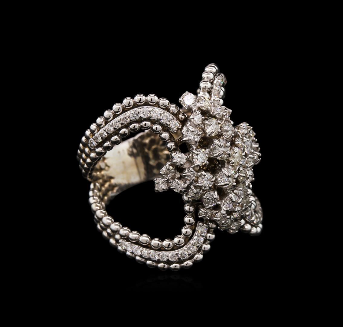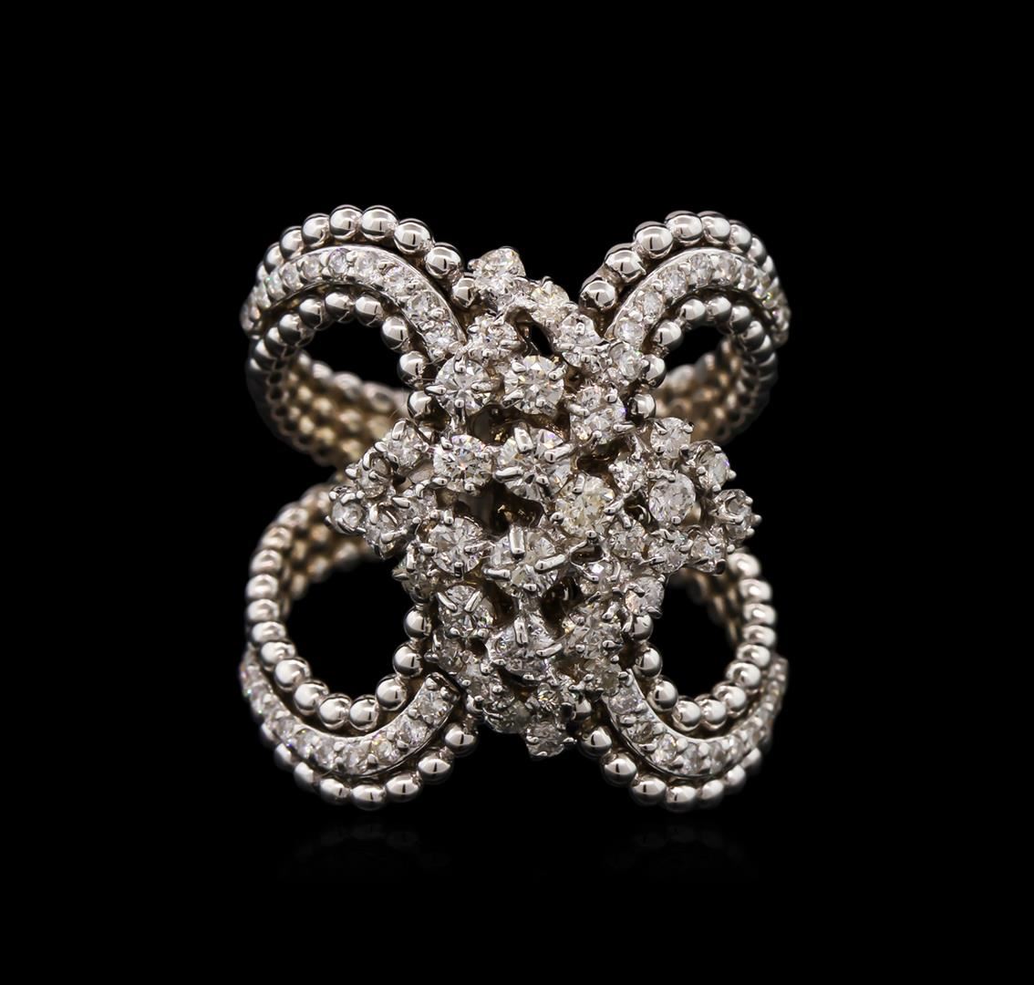 One electronically tested 14KT white gold ladies cast & assembled diamond ring with a bright polish finish. The ring features an organized diamond cluster supported by elaborate diamond set split shoulders with beaded detailing, completed by a six millimeter wide band. Identified with markings of "14K". Condition is new, good workmanship. Containing: Eighty-Two prong set round brilliant cut diamonds, measuring 2.20 - 1.20 x 1.02mm exact total weight 82 Stones = 1.24ct. Graded in the setting. Clarity: SI-1 to I-1. Color: G - I. Total Weight of Diamonds 1.24ct. Total Weight of Ring 8.47gm. AIG Appraised at $4,865.00.