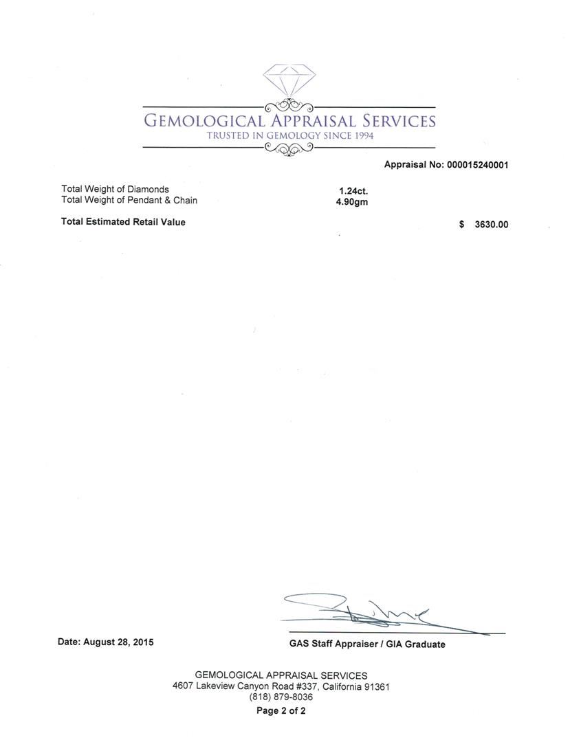 One electronically tested 14KT rose gold lady's combination cast & assembled fashion pendant & chain 16.0" long, 1mm diamond cut cable link with a lobster claw clasp with a bright polish finish. Identified with markings of "K14". Condition is new. Containing: One prong set round brilliant cut diamond, measuring 3.50 - 3.45 x 2.09mm (depth est.) approximate weight of 0.15ct. Graded in the setting. Clarity: I-1. Color: Good Six prong set round brilliant cut diamonds, measuring 2.80 - 2.70 x 1.65mm (depth est.) approximate total weight of 6 Stones = 0.46ct. Graded in the setting. Clarity: SI-2 to I-1. Color: H - I. Cut Good Nine prong set round brilliant cut diamonds, measuring 2.10 - 2.00 x 1.33mm (depth est.) approximate total weight of 9 Stones = 0.31ct. Graded in the setting. Clarity: SI-2 to I-1. Color: H - I. Cut Good Forty-Six prong set round brilliant cut diamonds, measuring 1.30 - 1.20 x 0.75mm (depth est.) approximate total weight of 46 Stones = 0.32ct. Graded in the setting. Clarity: SI-1 to I-1. Color: H - I. Cut Good. Total Weight of Diamonds 1.24ct. Total Weight of Pendant & Chain 4.90gm. GAS Appraised at $3,630.00.