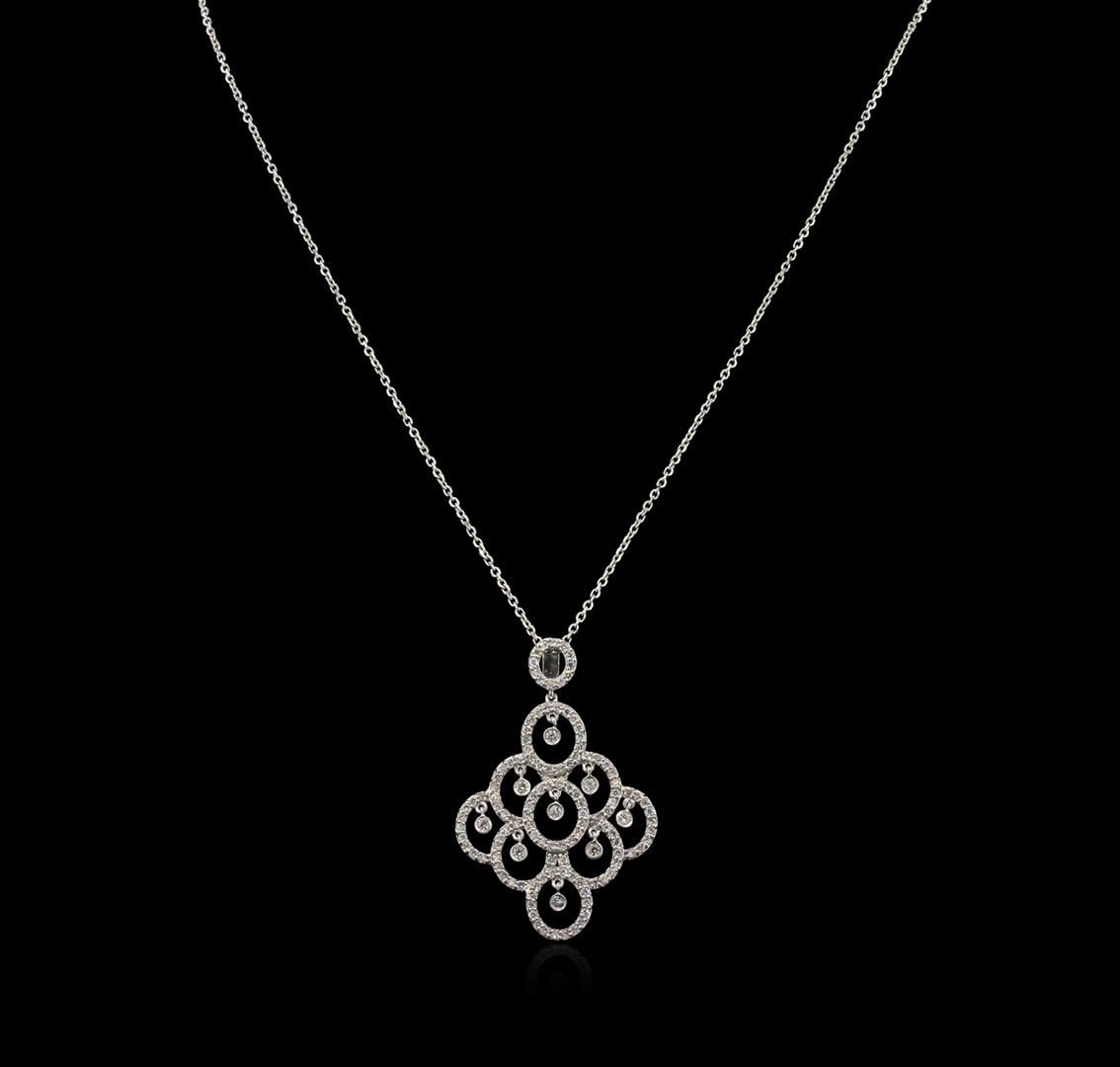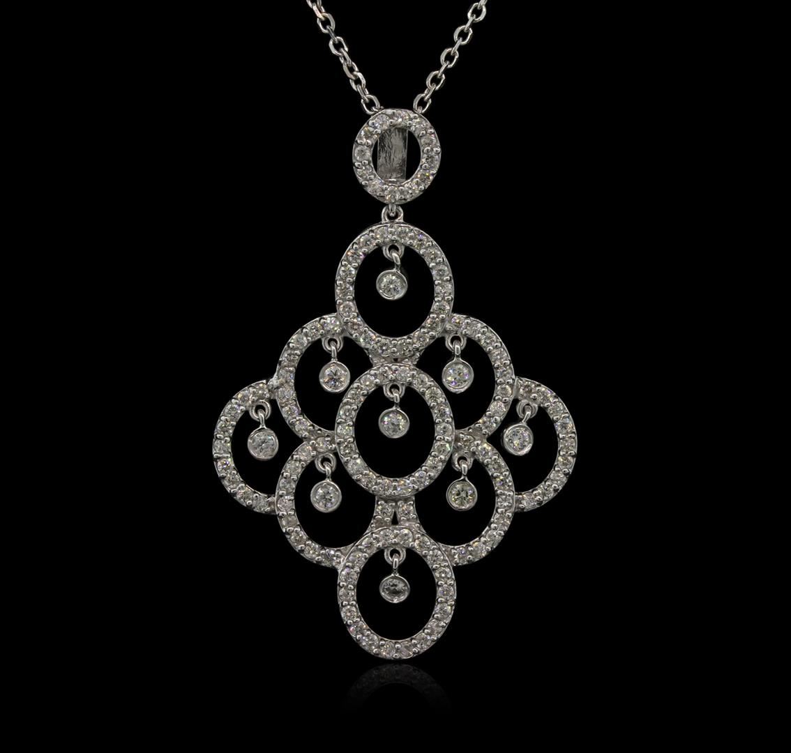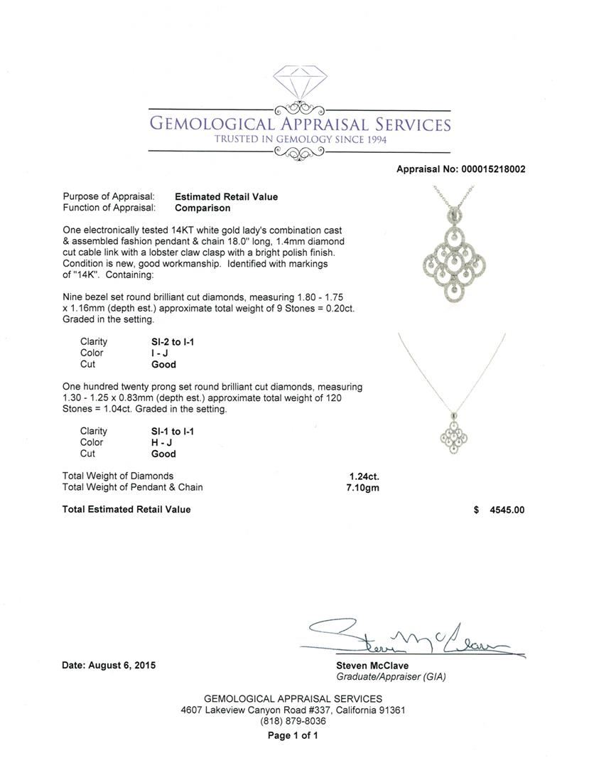 One electronically tested 14KT white gold lady's combination cast & assembled fashion pendant & chain 18.0" long, 1.4mm diamond cut cable link with a lobster claw clasp with a bright polish finish. Identified with markings of "14K". Condition is new, good workmanship. Containing: Nine bezel set round brilliant cut diamonds, measuring 1.80 - 1.75 x 1.16mm (depth est.) approximate. Total Weight of 9 Stones = 0.20ct. Graded in the setting. Clarity: SI-2 to I-1. Color: I - Good One Hundred Twenty prong set round brilliant cut diamonds, measuring 1.30 - 1.25 x 0.83mm (depth est.) approximate. Total Weight of 120 Stones = 1.04ct. Graded in the setting. Clarity: SI-1 to I-1. Color: H - Good. Total Weight of Diamonds 1.24ct. Total Weight of Pendant & Chain 7.10gm. GAS Appraised at $4,545.00.