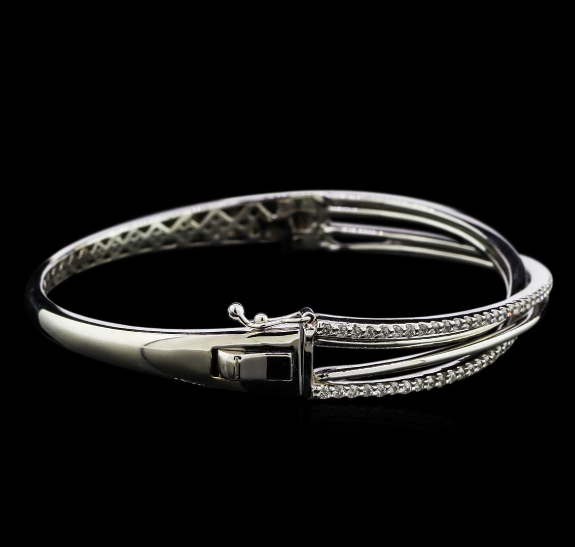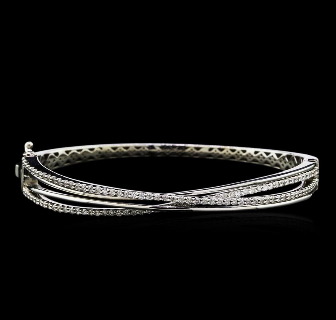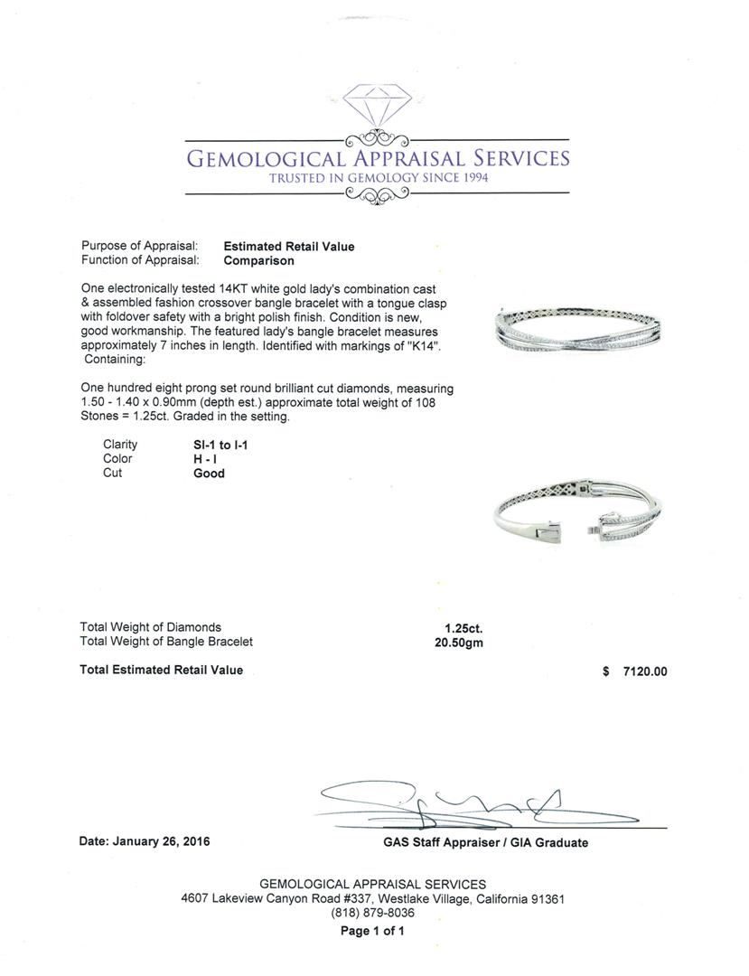 One electronically tested 14KT white gold lady's combination cast & assembled fashion crossover bangle bracelet with a tongue clasp with foldover safety with a bright polish finish. The featured lady's bangle bracelet measures approximately 7 inches in length. Identified with markings of "K14". Condition is new, good workmanship. Containing: One Hundred Eight prong set round brilliant cut diamonds, measuring 1.50 - 1.40 x 0.90mm (depth est.) approximate total weight of 108 Stones = 1.25ct. Graded in the setting. Clarity: SI-1 to I-1. Color: H - I. Cut Good. Total Weight of Diamonds 1.25ct. Total Weight of Bangle Bracelet 20.50gm. GAS Appraised at $7,120.00.