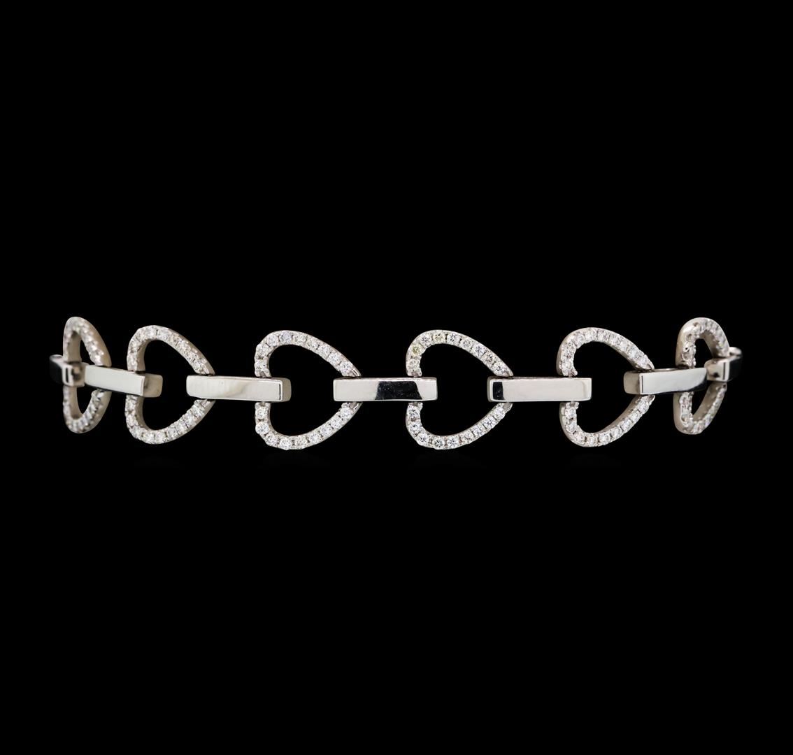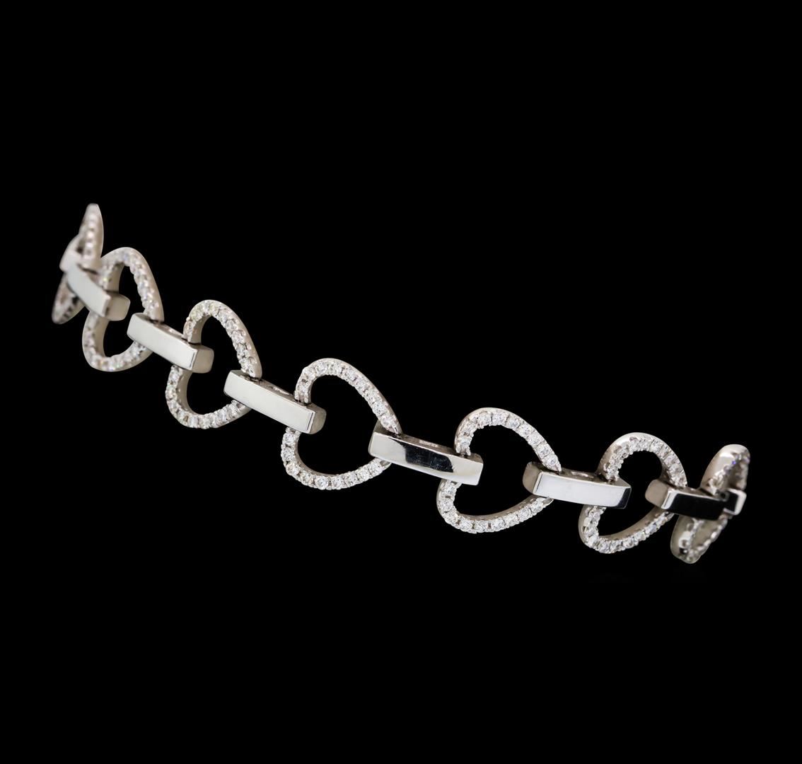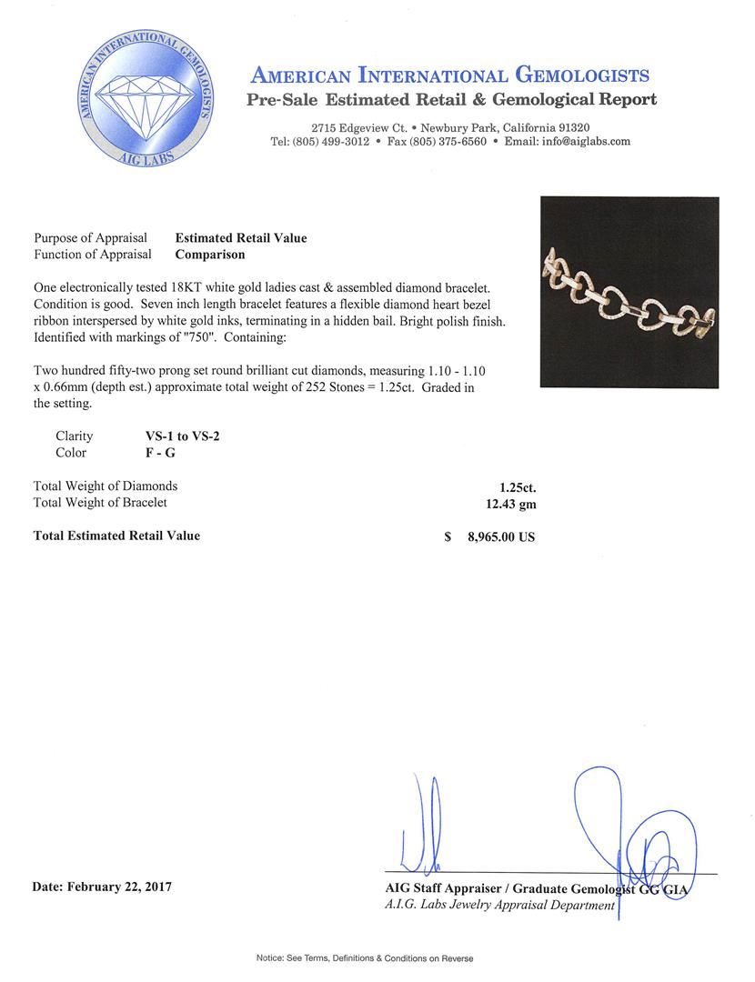 One electronically tested 18KT white gold ladies cast & assembled diamond bracelet. Seven inch length bracelet features a flexible diamond heart bezel ribbon interspersed by white gold inks, terminating in a hidden bail. Bright polish finish. Identified with markings of '750'. Condition is good. Containing: Two Hundred Fifty-Two prong set round brilliant cut diamonds, measuring 1.10 - 1.10 x 0.66mm (depth est.) approximate total weight of 252 Stones = 1.25ct. Graded in the setting. Clarity VS-1 to VS-2. Color: F - G. Total Weight of Diamonds 1.25ct.. Total Weight of Bracelet 12.43gm. AIG Appraised at $8,965.00.