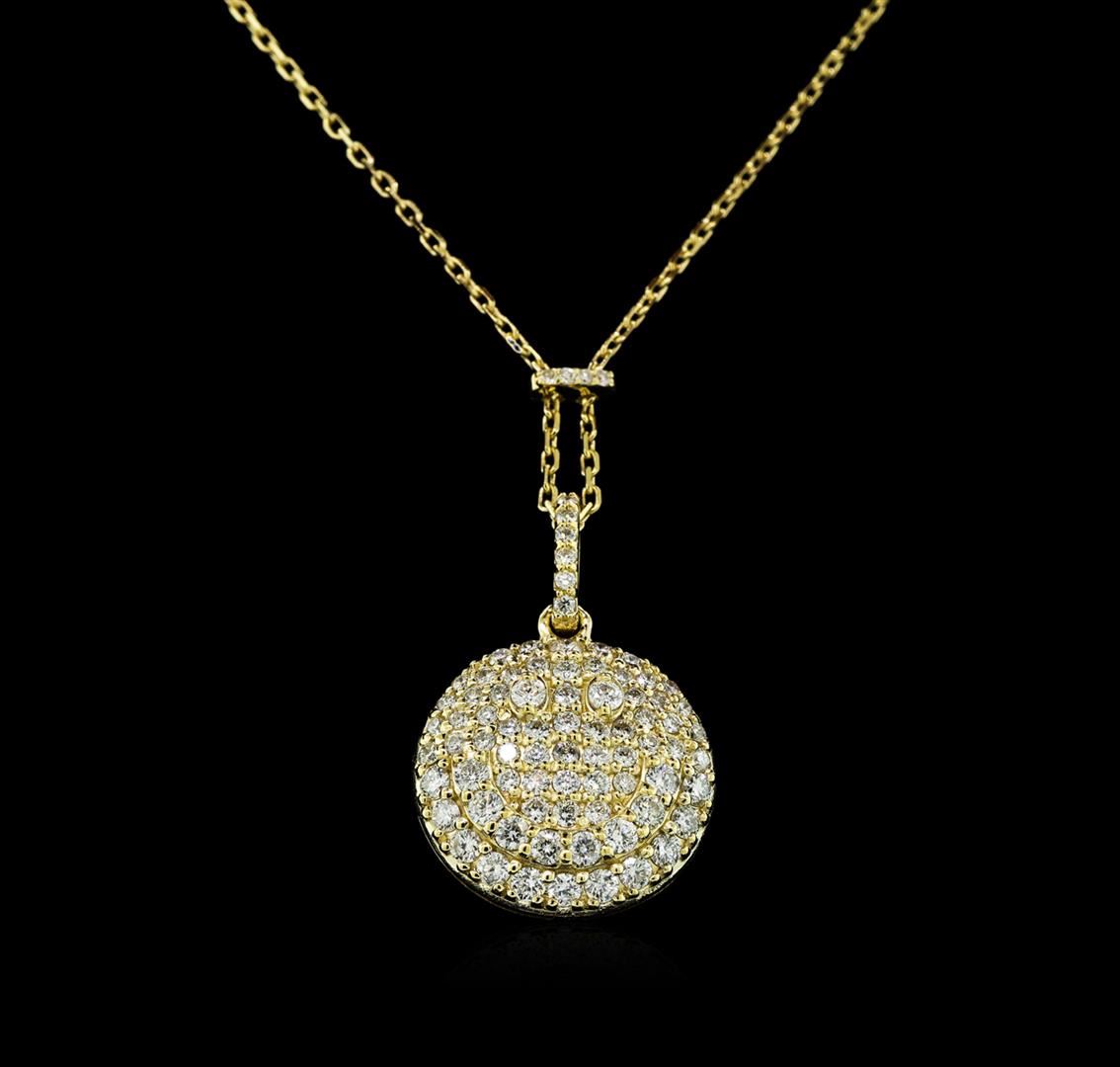 One electronically tested 14KT yellow gold lady's combination cast & assembled lariat necklace with a lobster claw clasp with a bright polish finish. The featured lady's necklace has a smiley face motif and an attached 18 inch long 1.2 millimeter diamond cut cable link chain. Identified with markings of 'K14'. Condition is new, good workmanship. Containing: Twenty-Two prong set round brilliant cut diamonds, measuring 2.00 - 1.90 x 1.21mm (depth est.) approximate total weight of 22 Stones = 0.62ct. Graded in the setting. Clarity SI-1 to SI-3. Color: H - I Cut Good Fifty prong set round brilliant cut diamonds, measuring 1.55 - 1.40 x 0.89mm (depth est.) approximate total weight of 50 Stones = 0.56ct. Graded in the setting. Clarity SI-1 to SI-2. Color: H - I Cut Good Ten prong set round brilliant cut diamonds, measuring 1.20 - 1.00 x 0.68mm (depth est.) approximate total weight of 10 Stones = 0.07ct. Graded in the setting. Clarity SI-1 to SI-2. Color: H - I Cut Good. Total Weight of Diamonds 1.25ct.. Total Weight of Necklace 6.70gm GAS Appraised at $4,390.00.