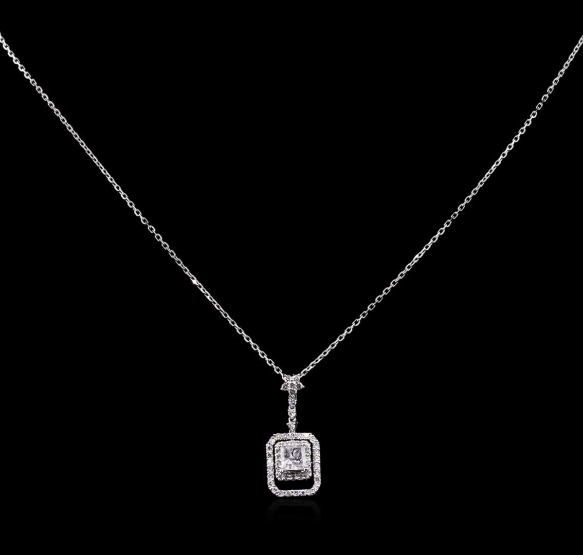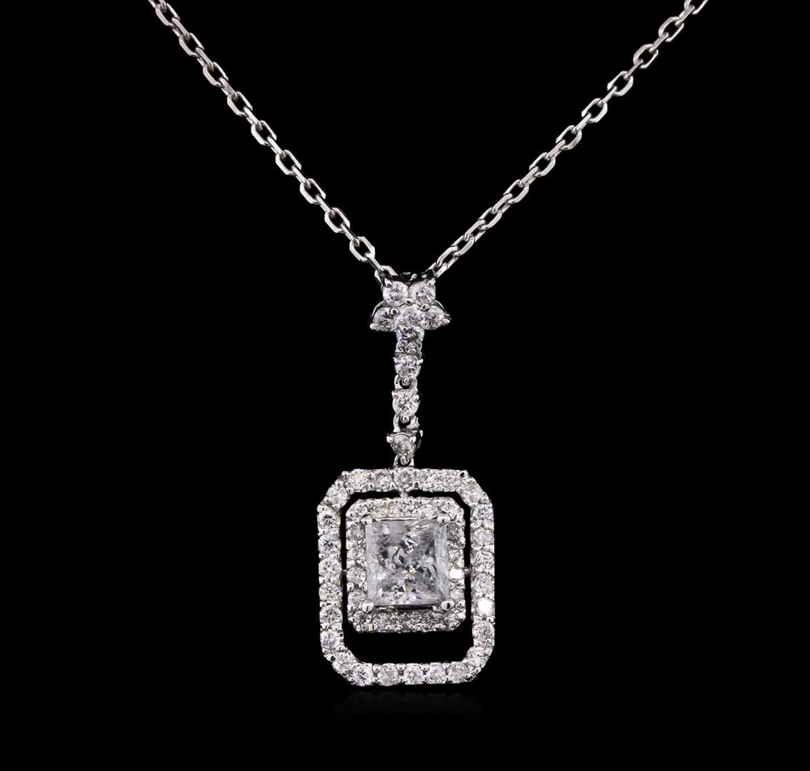 One electronically tested 14KT white gold lady's combination cast & assembled fashion pendant & chain 16.0" long, 1mm diamond cut cable link with a lobster claw clasp with a bright polish finish. Identified with markings of "K14". Condition is new, good workmanship. Containing: One prong set princess cut diamond, measuring 5.20 x 5.11 x 3.37mm (depth est.) approximate weight of 0.75ct. Graded in the setting. Clarity: I-1. Color: Good Nine prong set round brilliant cut diamonds, measuring 1.80 - 1.70 x 1.05mm (depth est.) approximate total weight of 9 Stones = 0.18ct. Graded in the setting. Clarity: SI-1 to SI-2. Color: H - I. Cut Good Forty-Four prong set round brilliant cut diamonds, measuring 1.30 - 1.20 x 0.76mm (depth est.) approximate total weight of 44 Stones = 0.32ct. Graded in the setting. Clarity: SI-1 to I-1. Color: H - J. Cut Good. Total Weight of Diamonds 1.25ct. Total Weight of Pendant & Chain 4.10gm. GAS Appraised at $6,225.00.
