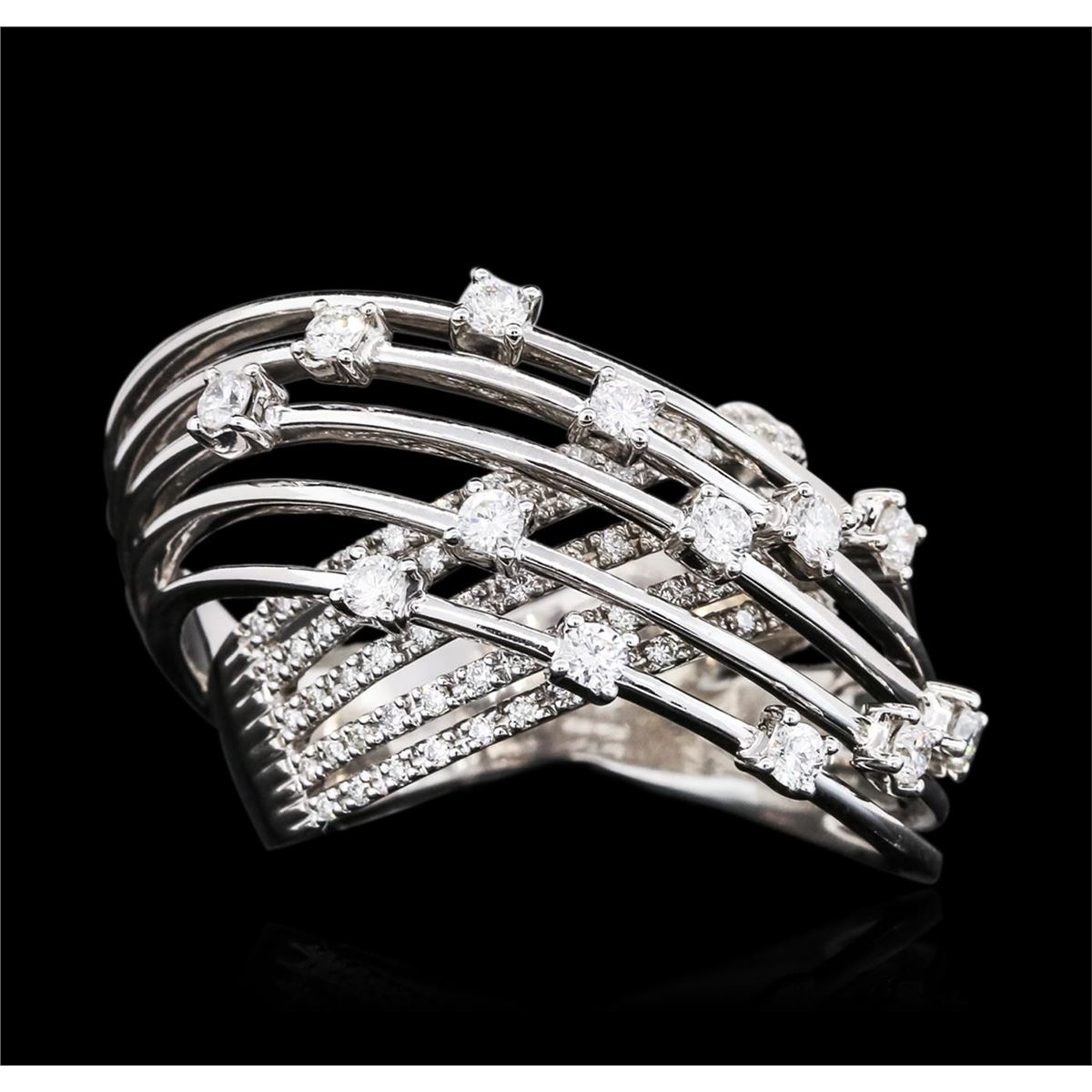 One electronically tested 14KT white gold lady's combination cast & assembled freeform ring with a bright polish finish. Condition is new, good workmanship. The featured ring has a diamond crossover motif with a 5.5 millimeter wide shank. Identified with markings of "14K". Containing: Thirteen prong set round brilliant cut diamonds, measuring 2.45 - 2.33 x 1.55mm (depth est.) approximate total weight of 13 Stones = 0.71ct. Graded in the setting. Clarity: VS-2 to SI-1. Color: G-H. Cut: Very Good. Ninety prong set round brilliant cut diamonds, measuring 1.20 - 1.10 x 0.75mm (depth est.) approximate total weight of 90 Stones = 0.54ct. Graded in the setting. Clarity: VS-2 to SI-1. Color: G-I. Cut: Good. Total Weight of Diamonds 1.25ct. Total Weight of Ring 15.00 grams. GAS Appraised at $5,520.00.