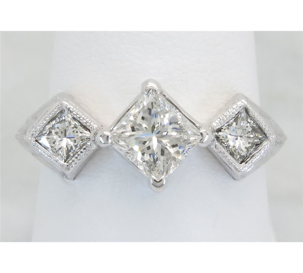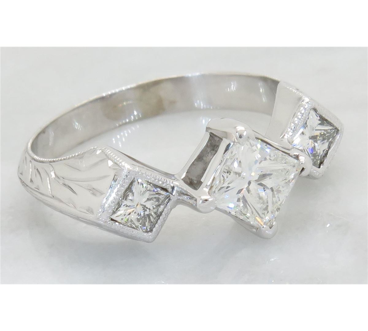 One tested 14K white gold diamond ring. Containing: One Princess Cut Diamond. Approximate Size: .81CT, Clarity: VS2, Color: F-G. 2 Princess Cut Diamonds. Approximate total diamond weight: 1.25CTW. All diamonds are graded in the mounting unless otherwise stated. Weight of ring: 3.9 grams, Size: 6.25.