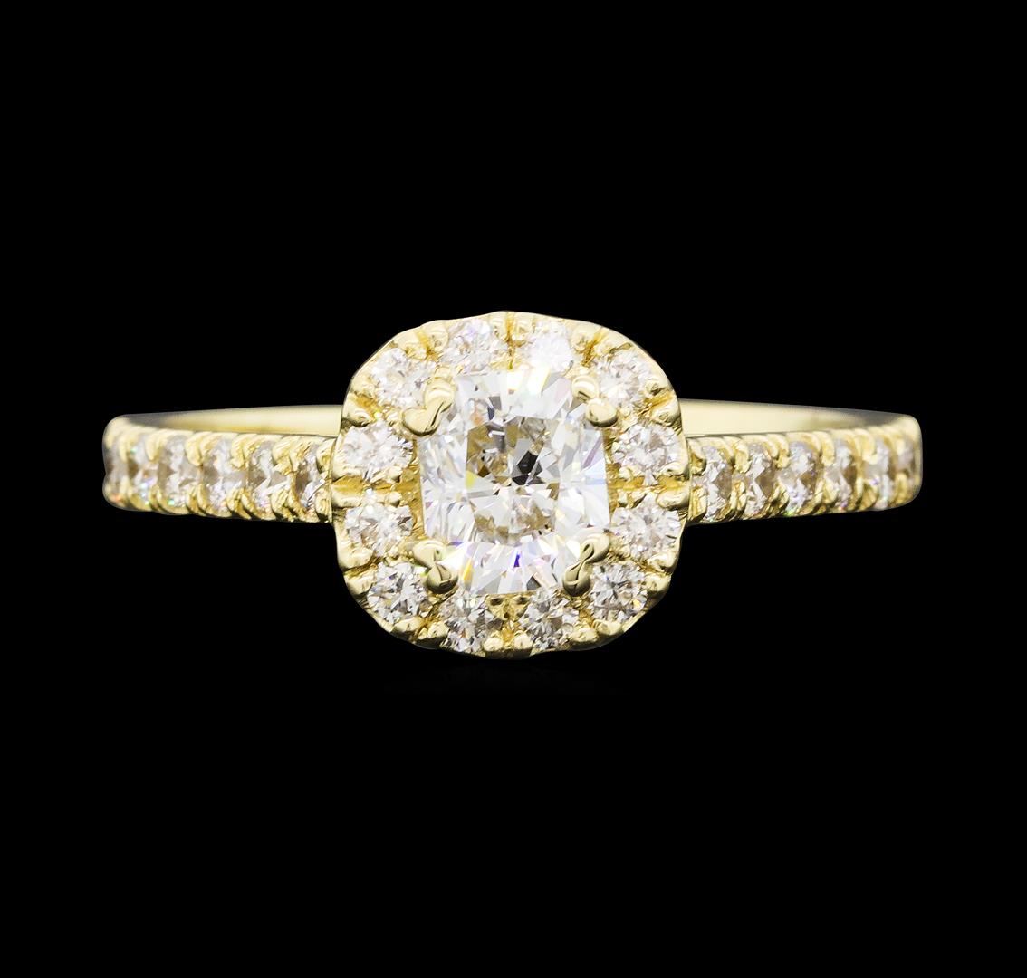 One electronically tested 14KT yellow gold lady's cast wedding ring with a cathedral shank with a halo with a bright polish finish. The featured lady's ring has a shank measuring 2.10 millimeters wide. Identified with markings of '14K'. Condition is new, good workmanship. Containing: One prong set princess cut diamond, measuring 5.45 x 4.56 x 3.42mm (depth est.) approximate weight of 0.70ct. Graded in the setting. Color H Clarity VS-2 Cut Very Good Twenty-Six prong set round brilliant cut diamonds, measuring 1.80 - 1.75 x 1.10mm (depth est.) approximate total weight of 26 Stones = 0.55ct. Graded in the setting. Color H - I Clarity VS-2 to SI-2 Cut Good. Total Weight of Diamonds 1.25ct.. Total Weight of Ring 2.70gm GAS Appraised at $7,760.00.