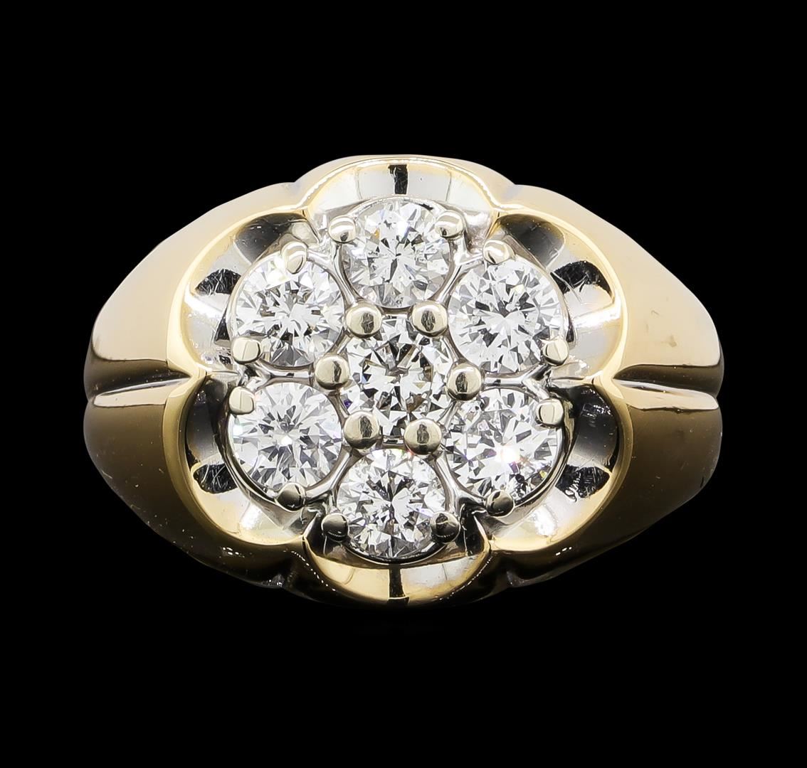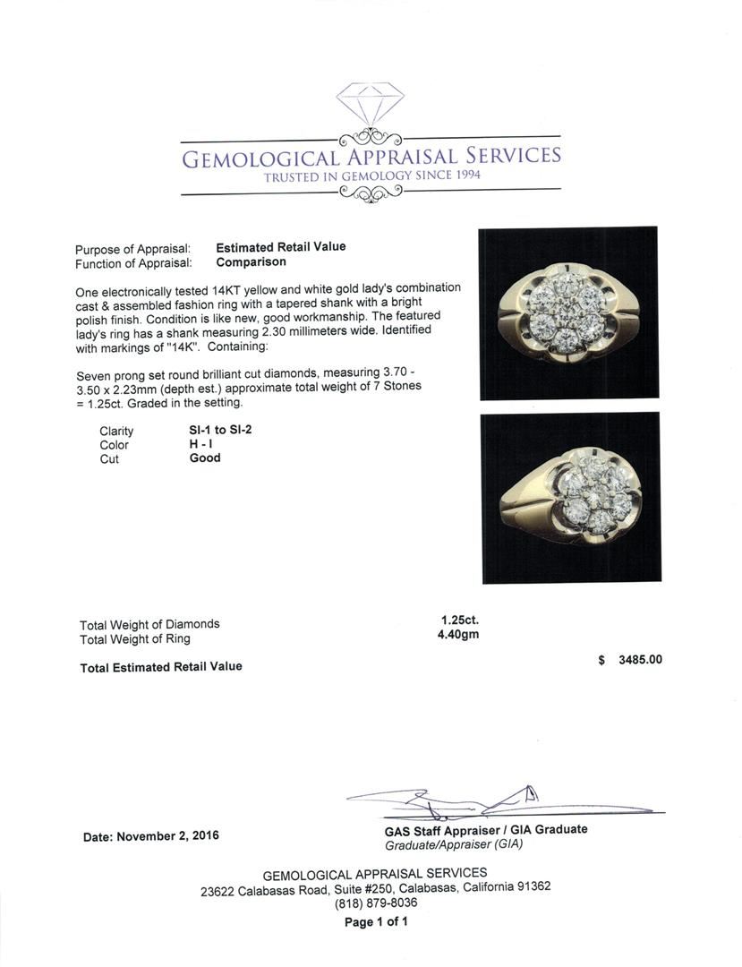 One electronically tested 14KT yellow and white gold lady's combination cast & assembled fashion ring with a tapered shank with a bright polish finish. The featured lady's ring has a shank measuring 2.30 millimeters wide. Identified with markings of '14K'. Condition is like new, good workmanship. Containing: Seven prong set round brilliant cut diamonds, measuring 3.70 - 3.50 x 2.23mm (depth est.) approximate total weight of 7 Stones = 1.25ct. Graded in the setting. Clarity SI-1 to SI-2. Color: H - I Cut Good. Total Weight of Diamonds 1.25ct.. Total Weight of Ring 4.40gm. GAS Appraised at $3,485.00.