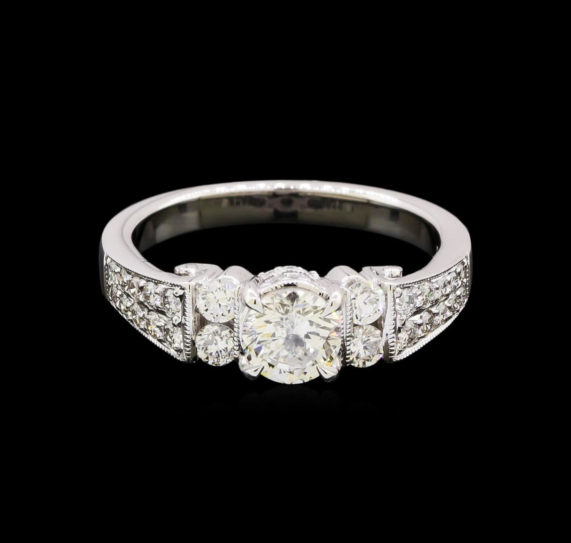 One electronically tested 18KT white gold lady's cast straight line wedding ring with a cathedral shank with a bright polish with milgrain detailing finish. The featured lady's ring has a shank measuring 2.50 millimeters in width. Identified with markings of "18K". Condition is new, good workmanship. Containing: One prong set round brilliant cut diamond, measuring 5.51 - 5.48 x 3.50mm (depth est.) , 10.00.%. GTCF approximate weight of 0.70ct. Graded in the setting. Clarity: I-1. Color: H - I. Cut Very Good Four channel set round brilliant cut diamonds, measuring 2.60 - 2.50 x 1.58mm (depth est.) approximate total weight of 4 Stones = 0.25ct. Graded in the setting. Clarity: SI-1 to SI-2. Color: G - Very Good Twenty prong set round brilliant cut diamonds, measuring 1.60 - 1.30 x 0.90mm (depth est.) approximate total weight of 20 Stones = 0.24ct. Graded in the setting. Clarity: SI-1 to SI-2. Color: G - Very Good Twelve prong set round brilliant cut diamonds, measuring 1.20 - 1.10 x 0.72mm (depth est.) approximate total weight of 12 Stones = 0.06ct. Graded in the setting. Clarity: SI-1 to SI-2. Color: G - Very Good. Total Weight of Diamonds 1.25ct. Total Weight of Ring 5.80gm. GAS Appraised at $6,715.00.