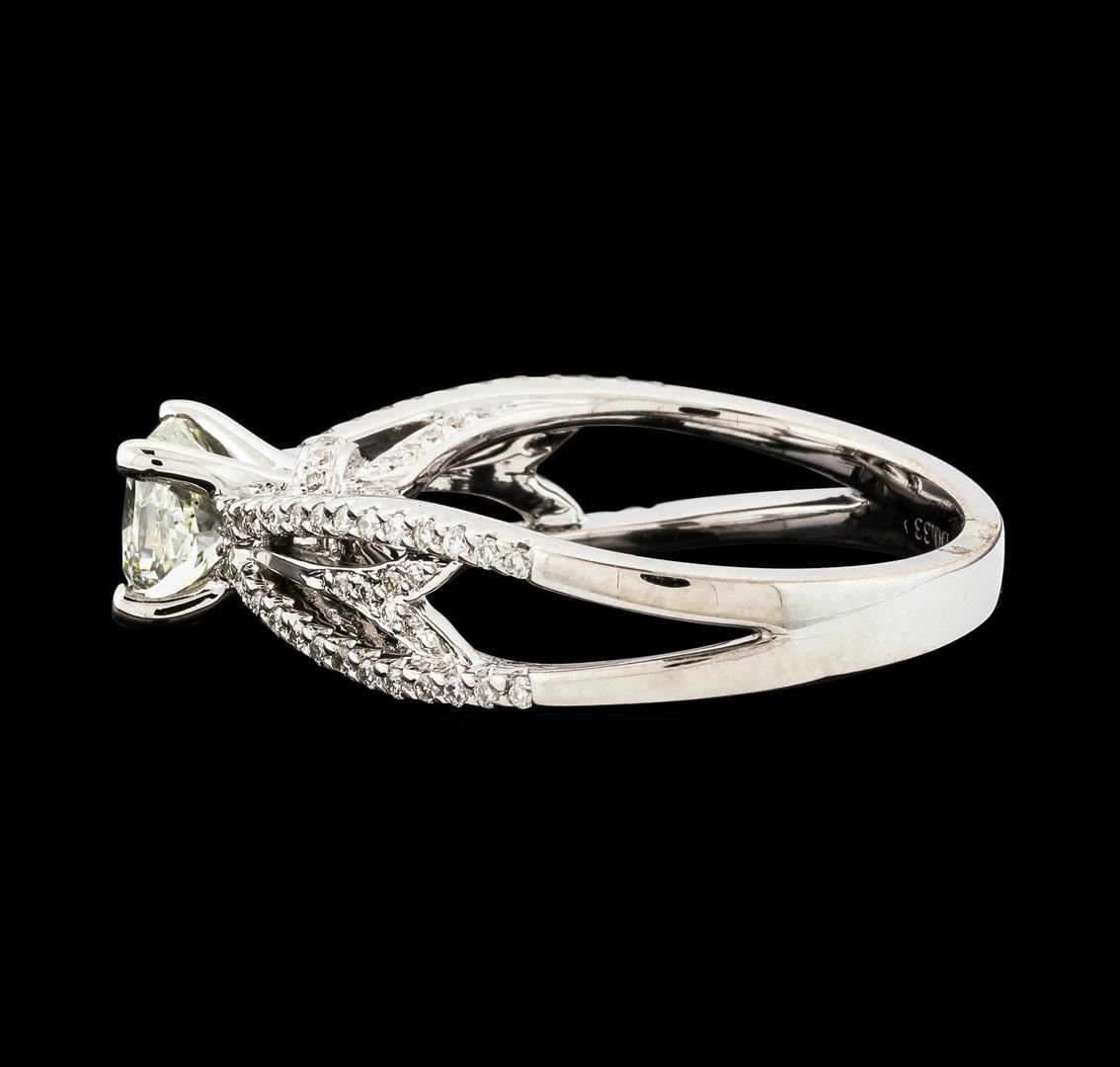 One electronically tested 18KT white gold lady's cast wedding ring with a split cathedral shank with a bright polish finish. The featured lady's ring has a shank measuring 2.75 millimeters wide. Identified with markings of 'K18'. Condition is new, good workmanship. Containing: One prong set cushion cut diamond, measuring 5.57 x 5.31 x 3.65mm (depth est.) approximate weight of 0.92ct. Graded in the setting. Clarity SI-1. Color: I - J Cut Very Good Ninety-Four prong set round brilliant cut diamonds, measuring 1.10 - 0.90 x 0.60mm (depth est.) approximate total weight of 94 Stones = 0.33ct. Graded in the setting. Clarity VS-2 to SI-1. Color: G - H Cut Very Good. Total Weight of Diamonds 1.25ct.. Total Weight of Ring 6.00gm. GAS Appraised at $10,530.00.