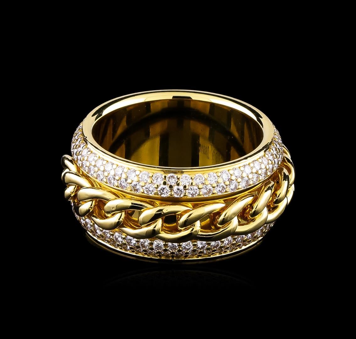 One electronically tested 18KT yellow gold ladies cast & assembled diamond ring with a bright polish finish. The ring is from Piaget's "Possession" Collection. This model is Colette/Possession Celebration. It was designed in 2010 to celebrate the 20th anniversary of Piaget's "Possession" line. The Colette features two closely intertwined rings, still allowing the center chain ribbon to freely rotate. The outer ring is accented by mirroring continuous diamond ribbons. Stamped E89504. The width of the ring is ten and one-half millimeters wide. US ring size 7.25. European ring size 55. Trademark is Piaget. Identified with markings of "750". Condition is good. Containing: One Hundred Eighty-Six bead set round brilliant cut diamonds, measuring 1.20 - 1.20 x 0.72mm (depth est.) approximate total weight of 186 Stones = 1.25ct. Graded in the setting. Clarity: VVS-2 to VS-1. Color: E - F. Total Weight of Diamonds 1.25ct.. Total Weight of Ring 18.80gm. AIG Appraised at $18,000.00.