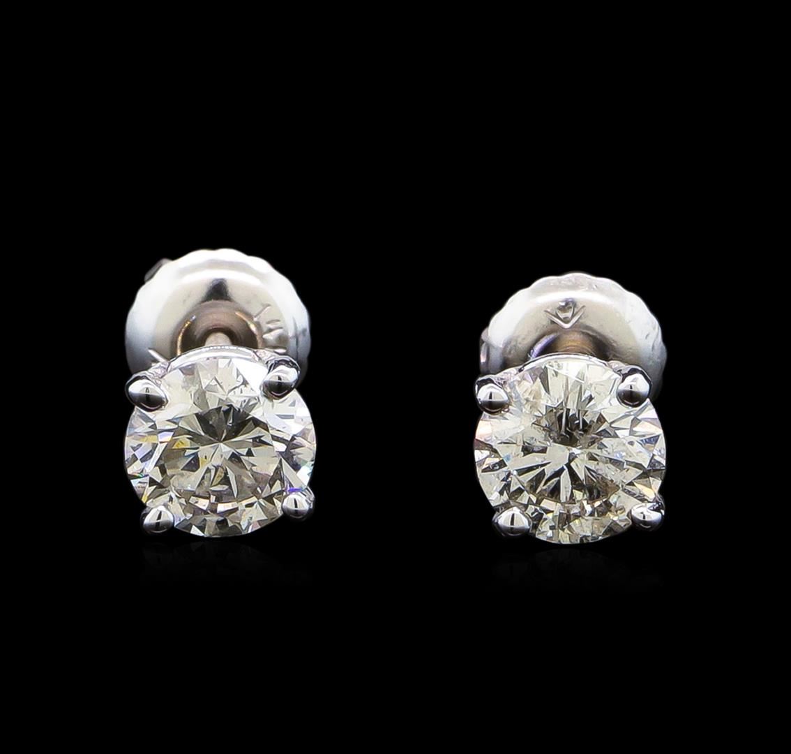 One pair electronically tested 14KT white gold lady's combination cast & assembled diamond stud earrings with threaded posts and screw-on/screw-off backs with a basket setting with a bright polish finish. Identified with markings of "14K". Condition is new, good workmanship. Containing: One prong set round brilliant cut diamond, measuring 5.42 - 5.40 x 3.52mm (depth est.) approximate weight of 0.63ct. Graded in the setting. Clarity: SI-2. Color: Good One prong set round brilliant cut diamond, measuring 5.41 - 5.38 x 3.46mm (depth est.) approximate weight of 0.62ct. Graded in the setting. Clarity: SI-3. Color: Good. Total Weight of Diamonds 1.25ct. Total Weight of Stud Earrings 1.10gm. GAS Appraised at $7,530.00.