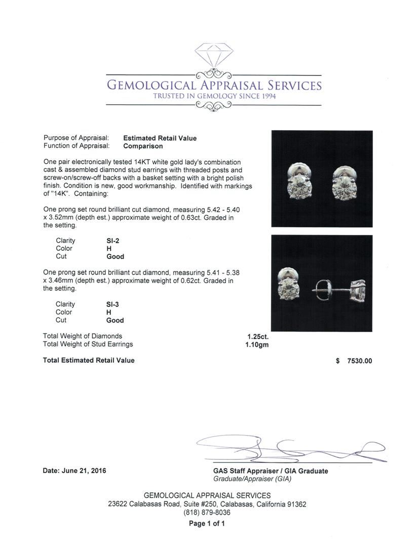 One pair electronically tested 14KT white gold lady's combination cast & assembled diamond stud earrings with threaded posts and screw-on/screw-off backs with a basket setting with a bright polish finish. Identified with markings of "14K". Condition is new, good workmanship. Containing: One prong set round brilliant cut diamond, measuring 5.42 - 5.40 x 3.52mm (depth est.) approximate weight of 0.63ct. Graded in the setting. Clarity: SI-2. Color: Good One prong set round brilliant cut diamond, measuring 5.41 - 5.38 x 3.46mm (depth est.) approximate weight of 0.62ct. Graded in the setting. Clarity: SI-3. Color: Good. Total Weight of Diamonds 1.25ct. Total Weight of Stud Earrings 1.10gm. GAS Appraised at $7,530.00.