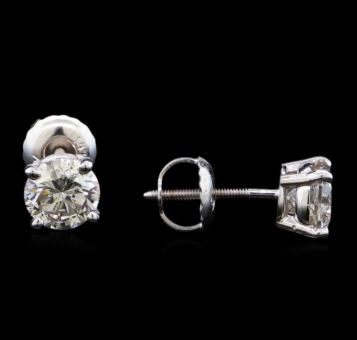 One pair electronically tested 14KT white gold lady's combination cast & assembled diamond stud earrings with threaded posts and screw-on/screw-off backs with a basket setting with a bright polish finish. Identified with markings of "14K". Condition is new, good workmanship. Containing: One prong set round brilliant cut diamond, measuring 5.42 - 5.40 x 3.52mm (depth est.) approximate weight of 0.63ct. Graded in the setting. Clarity: SI-2. Color: Good One prong set round brilliant cut diamond, measuring 5.41 - 5.38 x 3.46mm (depth est.) approximate weight of 0.62ct. Graded in the setting. Clarity: SI-3. Color: Good. Total Weight of Diamonds 1.25ct. Total Weight of Stud Earrings 1.10gm. GAS Appraised at $7,530.00.