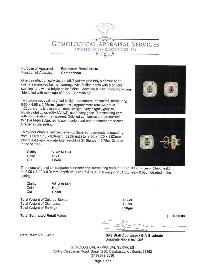 One pair electronically tested 18KT yellow gold lady's combination cast & assembled fashion earrings with friction posts with a square cushion halo with a bright polish finish. Identified with markings of '18K'. Condition is new, good workmanship. Containing: Two prong set oval modified brilliant cut natural tanzanites, measuring 6.50 x 4.55 x 2.96mm, (depth est.) approximate total weight of 1.25ct., clarity is eye clean, medium light, very slightly grayish, bluish violet color, (GIA bV 4/3), cut is very good. Transmitting light with no distortion, transparent. Colored gemstones are presumed to have been subjected to commonly used enhancement processes. Graded in the setting. Thirty-Four channel set baguette cut (tapered) diamonds, measuring from 1.90 x 1.10 x 0.94mm (depth est.) to 2.30 x 1.20 x 1.02mm (depth est.) approximate total weight of 34 Stones = 0.75ct. Graded in the setting. Color H - I Clarity VS-2 to SI-1 Cut Good Thirty-One channel set baguette cut diamonds, measuring from 1.90 x 1.00 x 0.85mm (depth est.) to 2.00 x 1.10 x 0.94mm (depth est.) approximate total weight of 31 Stones = 0.52ct. Graded in the setting. Color H - I Clarity VS-2 to SI-1 Cut Good. Total Weight of Colored Stones 1.25ct.. Total Weight of Diamonds 1.27ct.. Total Weight of Earrings 7.90gm GAS Appraised at $4,900.00.