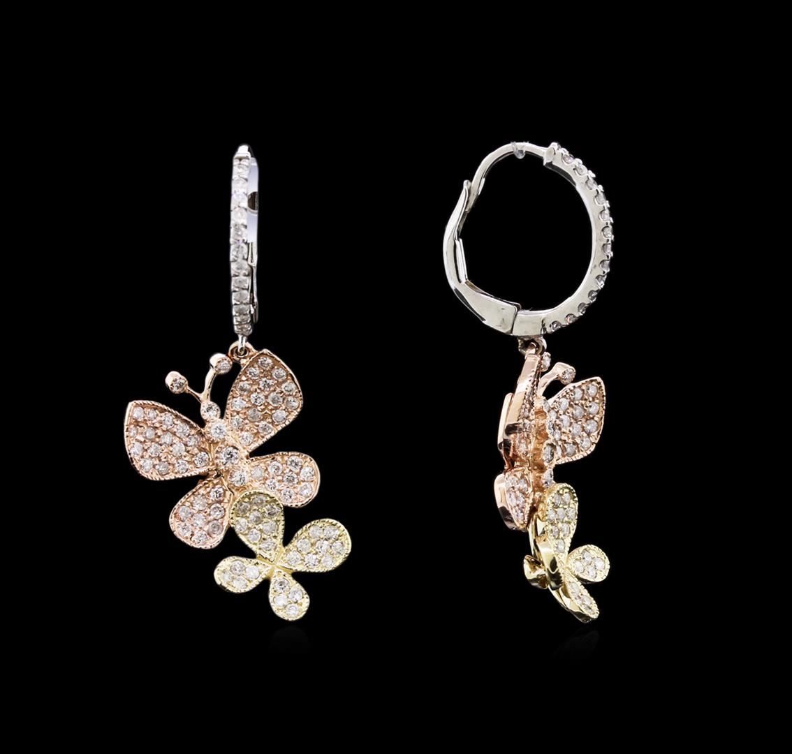One pair electronically tested 14KT rose, yellow and white gold ladies cast & assembled diamond butterfly dangle earrings with lever backs. Each earring features a diamond set rose gold butterfly accented by a yellow gold diamond set flower dangle, completed by a white gold diamond set huggie. Bright polish finish. Identified with markings of "K14". Condition is new, good workmanship. Containing: One Hundred Eighty-Two bead & bezel set round brilliant cut diamonds, measuring 1.40 - 1.10 x 0.75mm exact total weight 182 Stones = 1.25ct. Graded in the setting. Clarity: I-1 to I-2. Color: F - H. Total Weight of Diamonds 1.25ct. Total Weight of Earrings 6.10gm. AIG Appraised at $4,700.00.