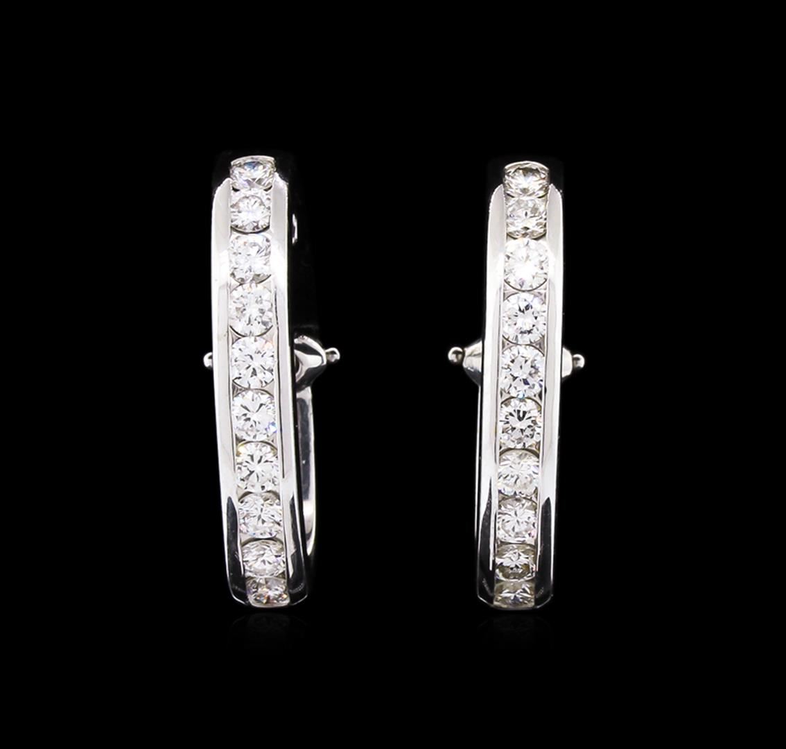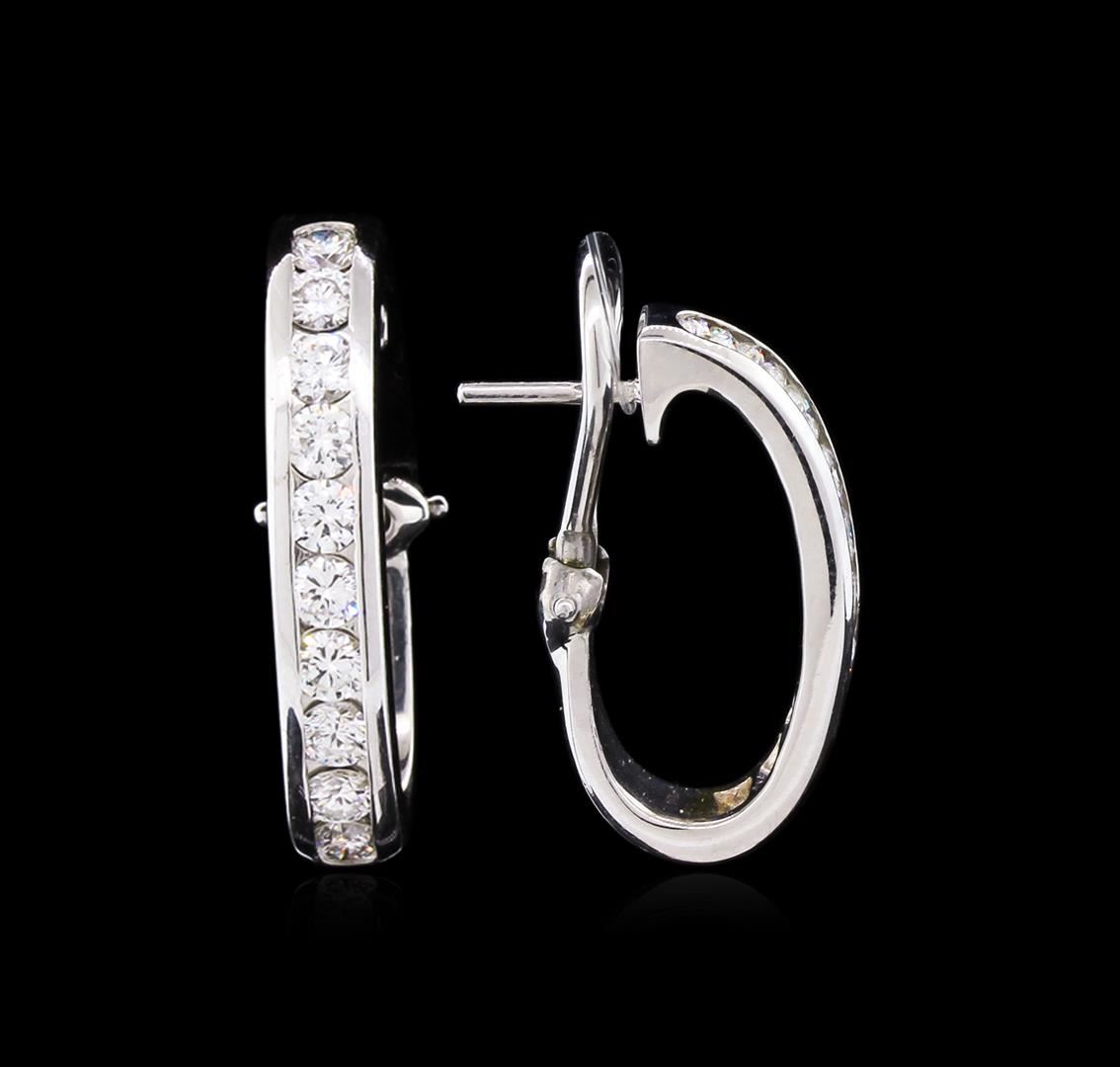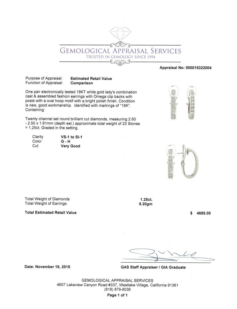 One pair electronically tested 18KT white gold lady's combination cast & assembled fashion earrings with Omega clip backs with posts with a oval hoop motif with a bright polish finish. Identified with markings of "18K". Condition is new, good workmanship. Containing: Twenty channel set round brilliant cut diamonds, measuring 2.60 - 2.50 x 1.61mm (depth est.) approximate. Total Weight of 20 Stones = 1.25ct. Graded in the setting. Clarity: VS-1 to SI-1. Color: G - Very Good. Total Weight of Diamonds 1.25ct. Total Weight of Earrings 8.20gm. GAS Appraised.