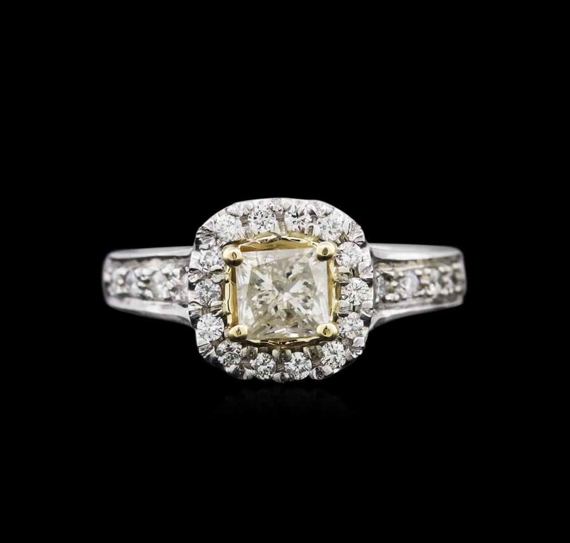 One electronically tested 14KT white and yellow gold ladies cast diamond engagement ring with a bright polish finish. Identified with markings of "14K". Condition is new. Containing: One prong set princess cut diamond, measuring 5.20 x 4.80 x 3.60mm (depth est.) approximate weight of 0.87ct. Clarity: I-2. Color: M, Cut is Good. Twenty-Four prong set round brilliant cut diamonds, measuring 1.50 - 1.50 x 0.90mm (depth est.) approximate total weight of 24 Stones = 0.38ct. Clarity: I-1. Color: I, Cut is Good. Diamonds are graded in the mounting, unless otherwise stated. Total Weight of Diamonds 1.25ct. Total Weight of Engagement Ring 7.20 grams. GGL Appraised at $3,520.00.