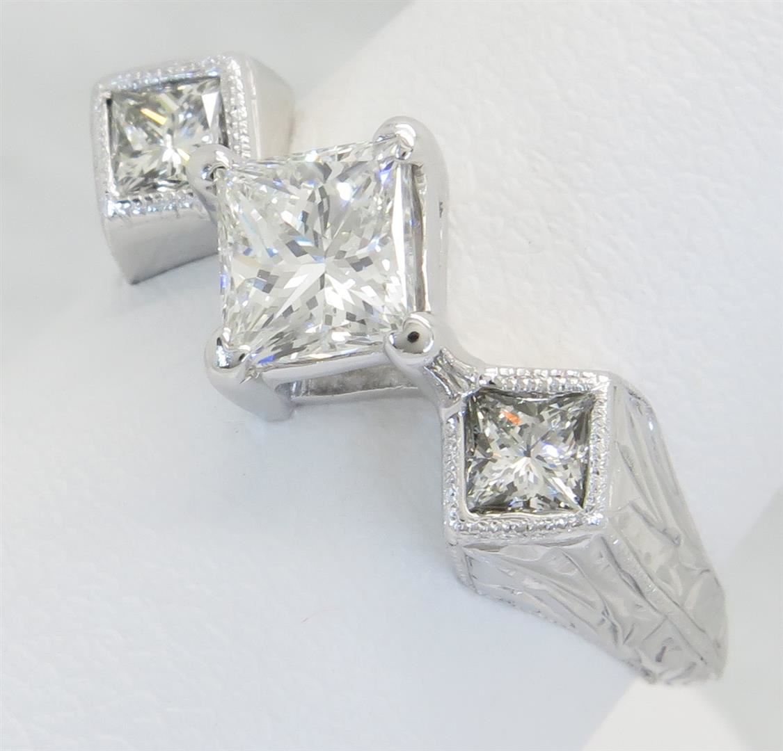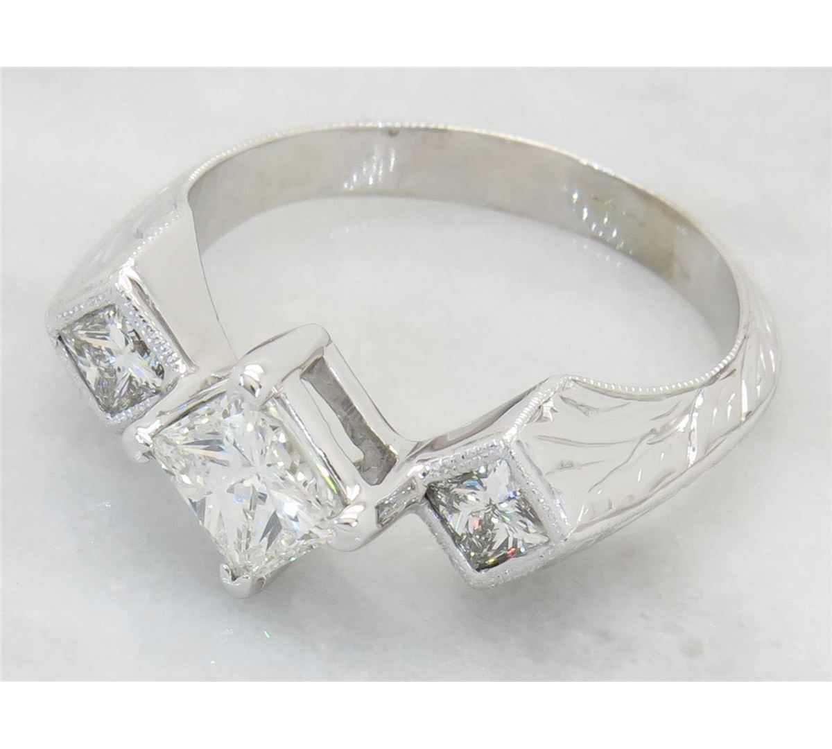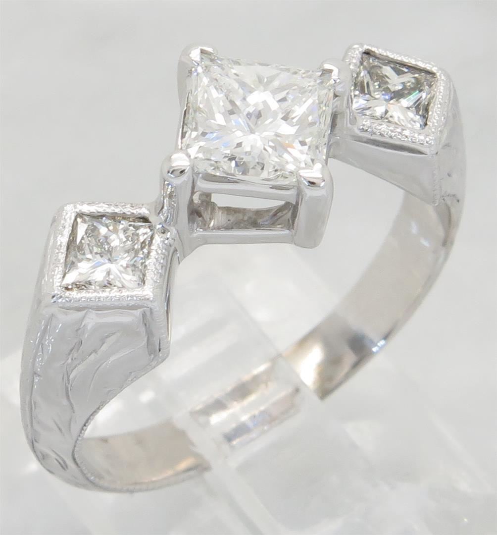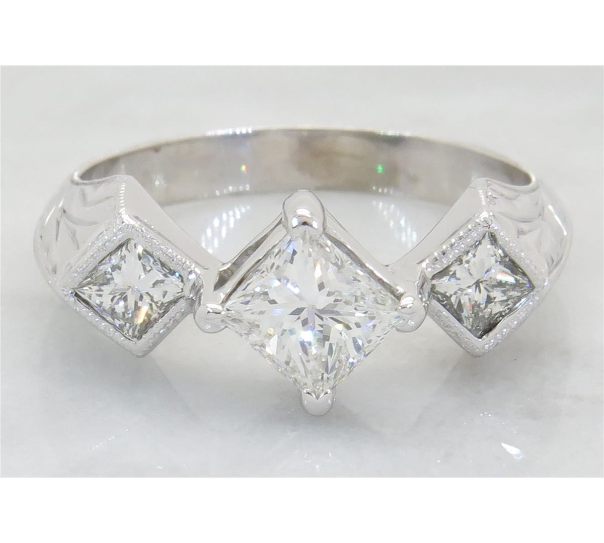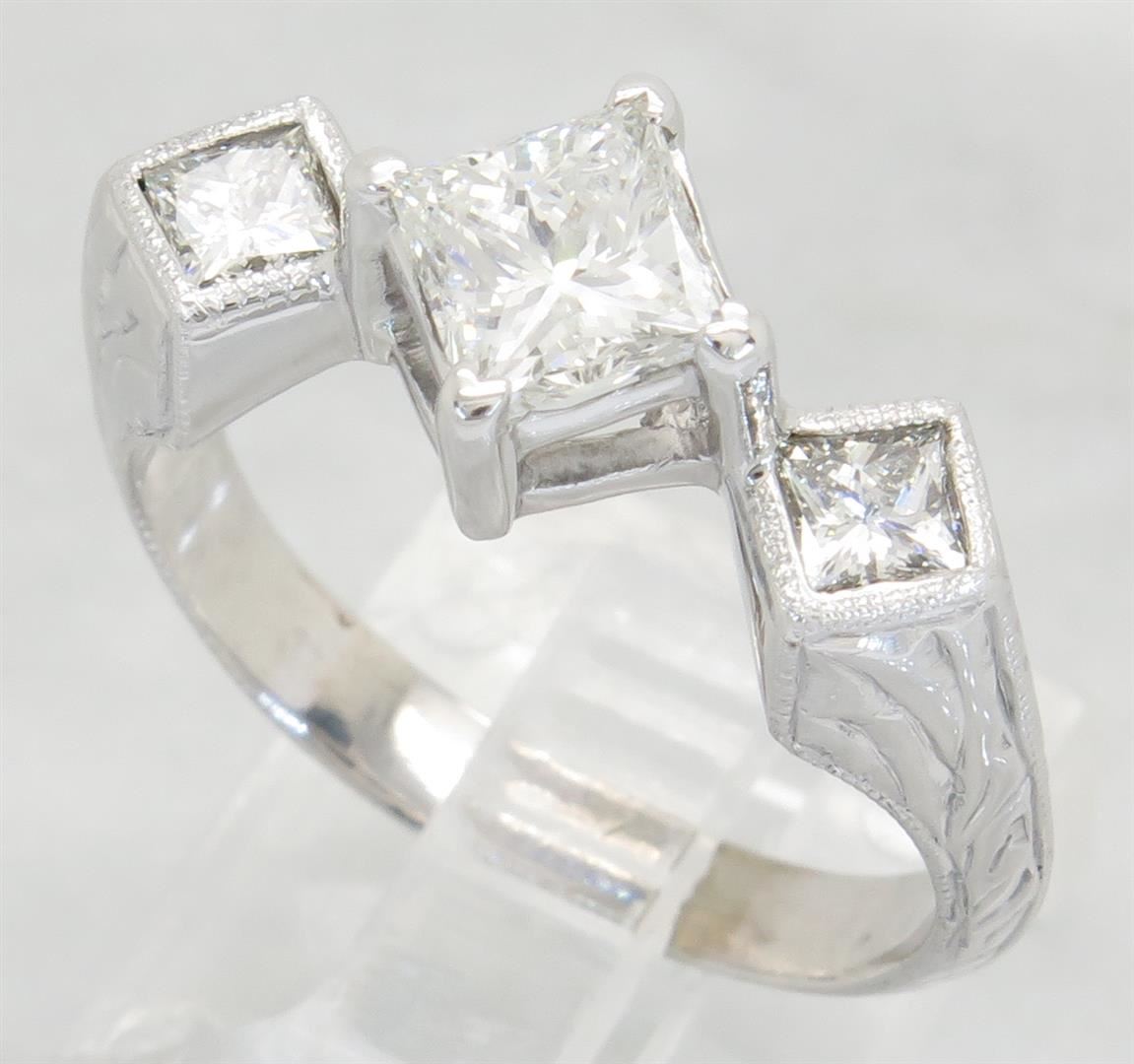 One tested 14K white gold diamond ring. Containing: One Princess Cut Diamond. Approximate Size: .81CT, Clarity: VS2, Color: F-G. 2 Princess Cut Diamonds. Approximate total diamond weight: 1.25CTW. All diamonds are graded in the mounting unless otherwise stated. Weight of ring: 3.9 grams, Size: 6.25.