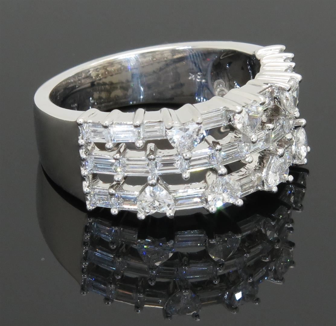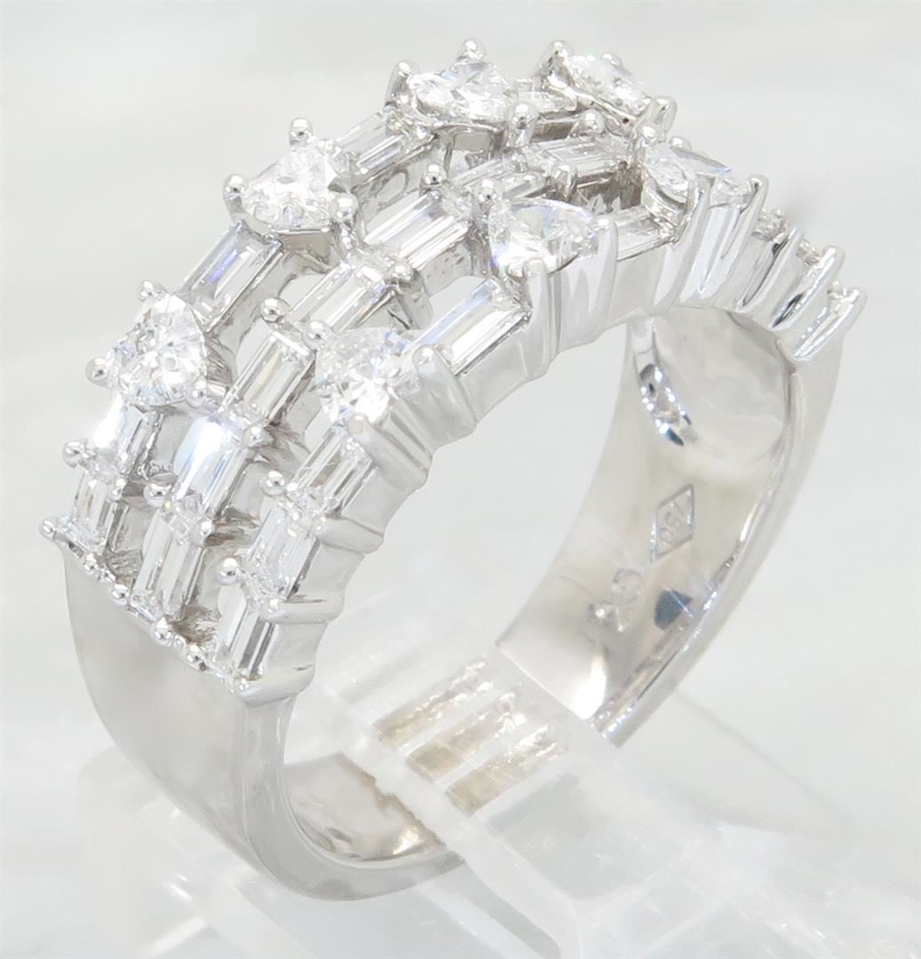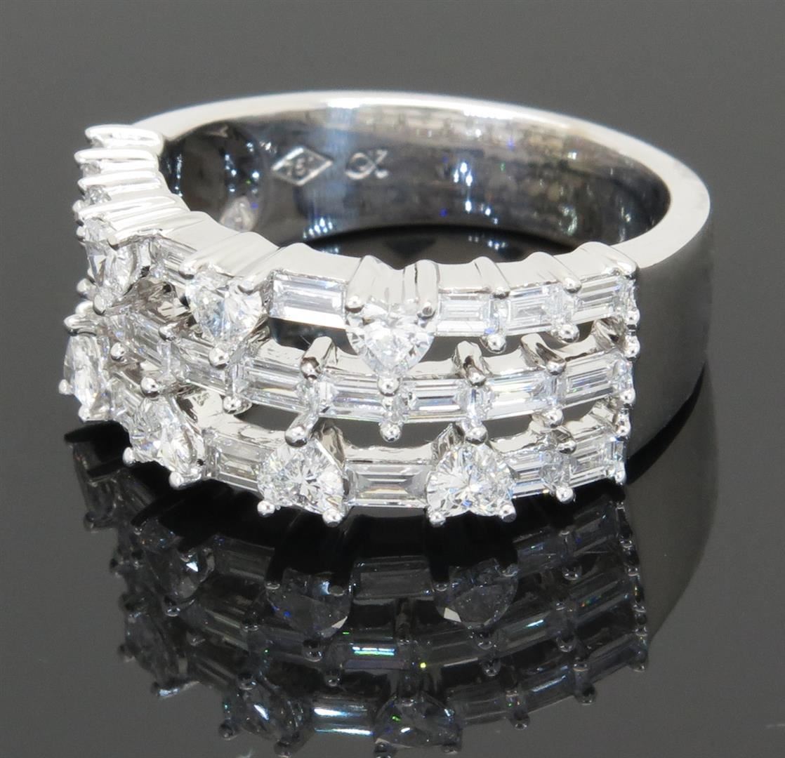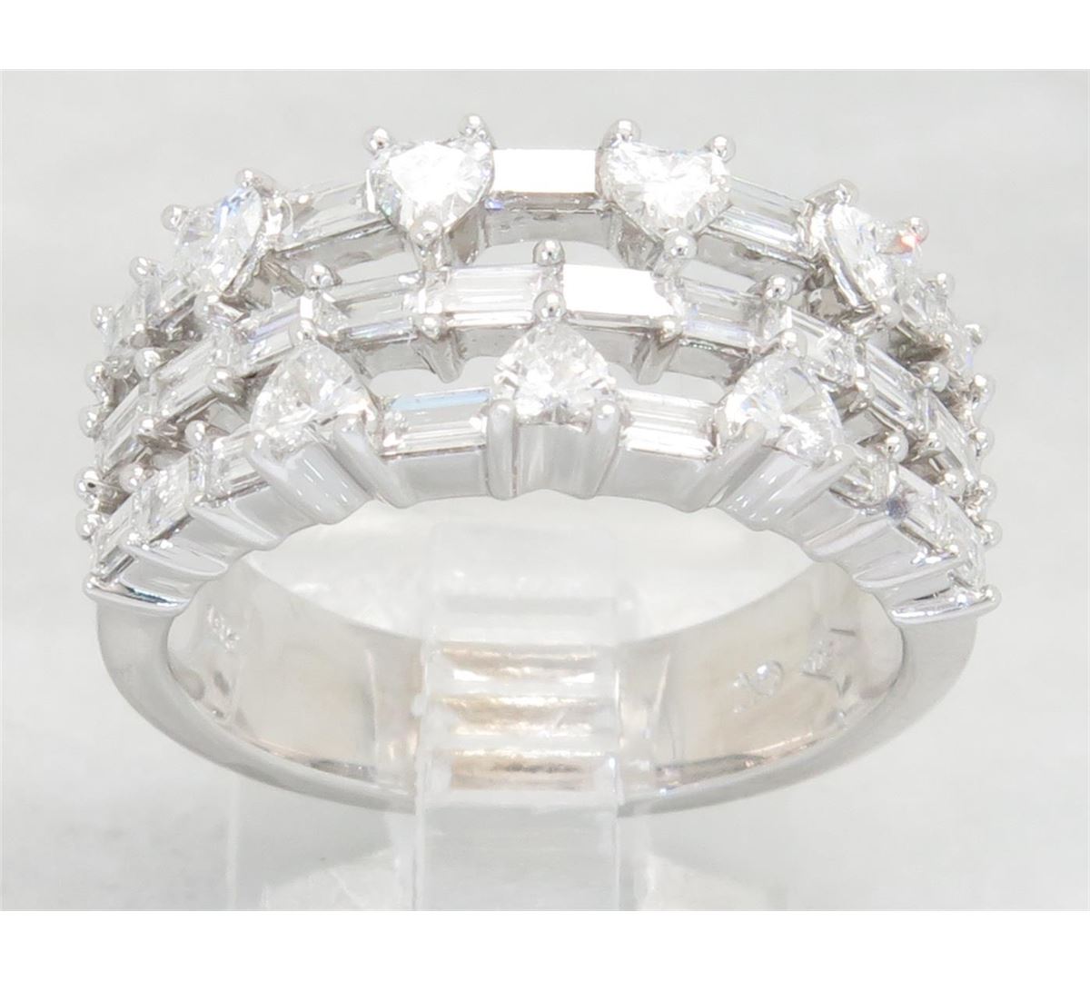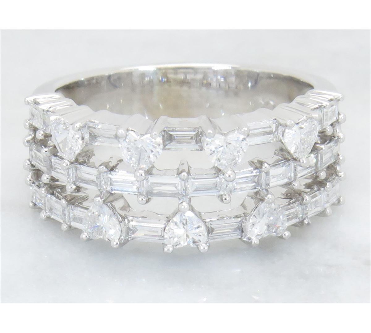 One tested 18K white gold diamond ring. Containing: 7 Heart Shaped Diamonds, 25 Baguette Cut Diamonds. Clarity: VS-SI, Color: F-G. Approximate total diamond weight: 1.25CTW. Diamonds are graded in the mounting, unless otherwise stated. Weight of ring: 7.7 grams. Size: 7.0.