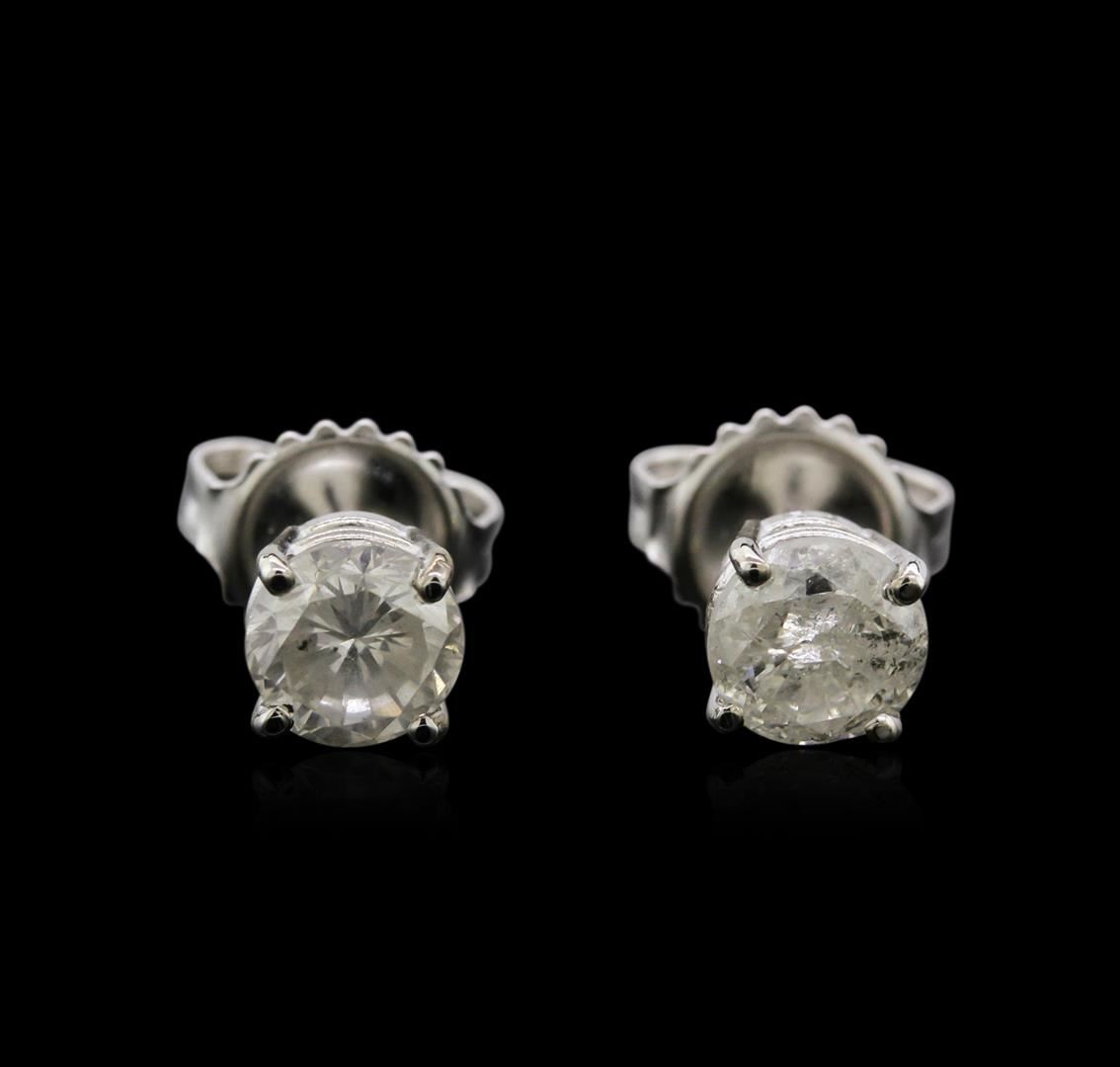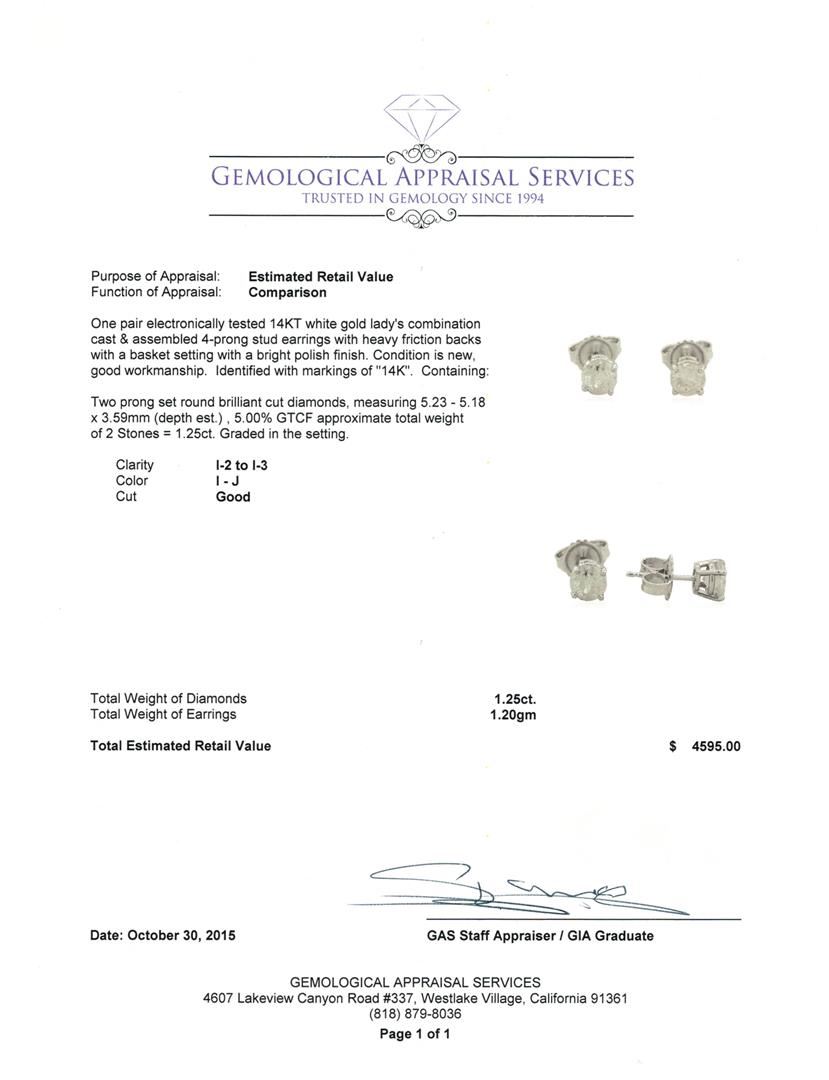 One pair electronically tested 14KT white gold lady's combination cast & assembled 4-prong stud earrings with heavy friction backs with a basket setting with a bright polish finish. Identified with markings of "14K". Condition is new, good workmanship. Containing: Two prong set round brilliant cut diamonds, measuring 5.23 - 5.18 x 3.59mm (depth est.) , 5.00% GTCF approximate total weight of 2 Stones = 1.25ct. Graded in the setting. Clarity: I-2 to I-3. Color: I - Good. Total Weight of Diamonds 1.25ct. Total Weight of Earrings 1.20gm. GAS Appraised.