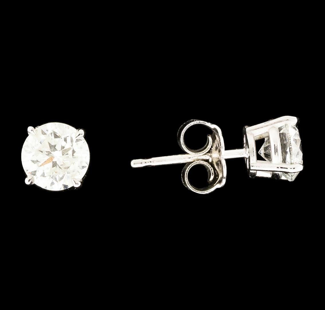 One pair electronically tested 14KT white gold cast & assembled diamond solitaire earrings with standard backs. Bright polish finish. Identified with markings of '14K'. Condition is good. Containing: One prong set round brilliant cut diamond, measuring 5.30 - 5.30 x 3.50mm (depth est.) approximate weight of 0.64ct. Graded in the setting. Clarity I-2. Color: H Depth 66.0%. Table: 56.6%. One prong set round brilliant cut diamond, measuring 5.30 - 5.30 x 3.18mm (depth est.) approximate weight of 0.62ct with a strong blue fluorescence. Graded in the setting. Clarity I-2. Color: J Depth 60.0%. Table: 58.5%.. Total Weight of Diamonds 1.26ct.. Total Weight of Earrings 1.04gm. AIG Appraised at $4,500.00.