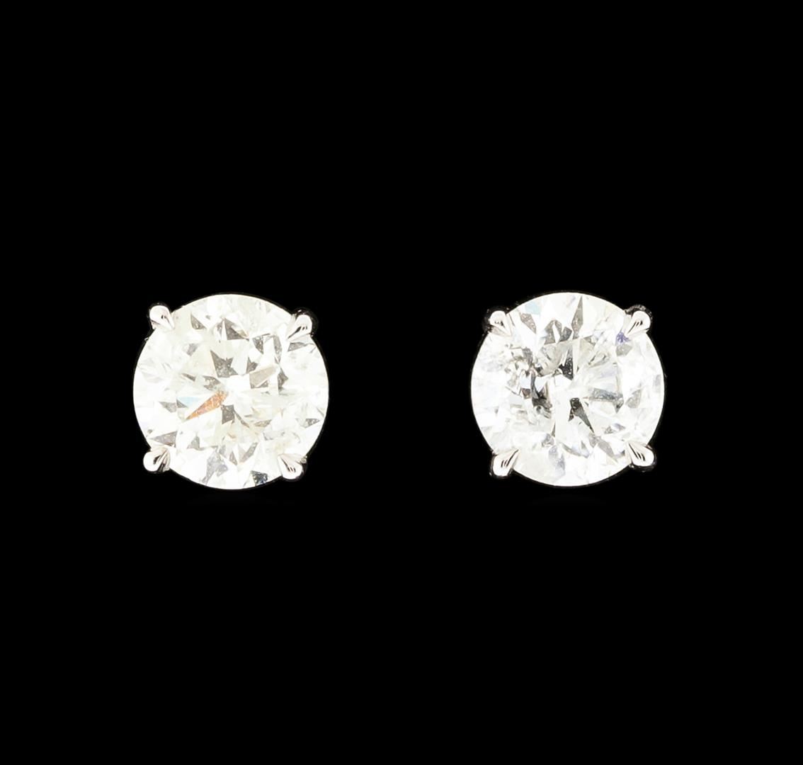 One pair electronically tested 14KT white gold cast & assembled diamond solitaire earrings with standard backs. Bright polish finish. Identified with markings of '14K'. Condition is good. Containing: One prong set round brilliant cut diamond, measuring 5.30 - 5.30 x 3.50mm (depth est.) approximate weight of 0.64ct. Graded in the setting. Clarity I-2. Color: H Depth 66.0%. Table: 56.6%. One prong set round brilliant cut diamond, measuring 5.30 - 5.30 x 3.18mm (depth est.) approximate weight of 0.62ct with a strong blue fluorescence. Graded in the setting. Clarity I-2. Color: J Depth 60.0%. Table: 58.5%.. Total Weight of Diamonds 1.26ct.. Total Weight of Earrings 1.04gm. AIG Appraised at $4,500.00.