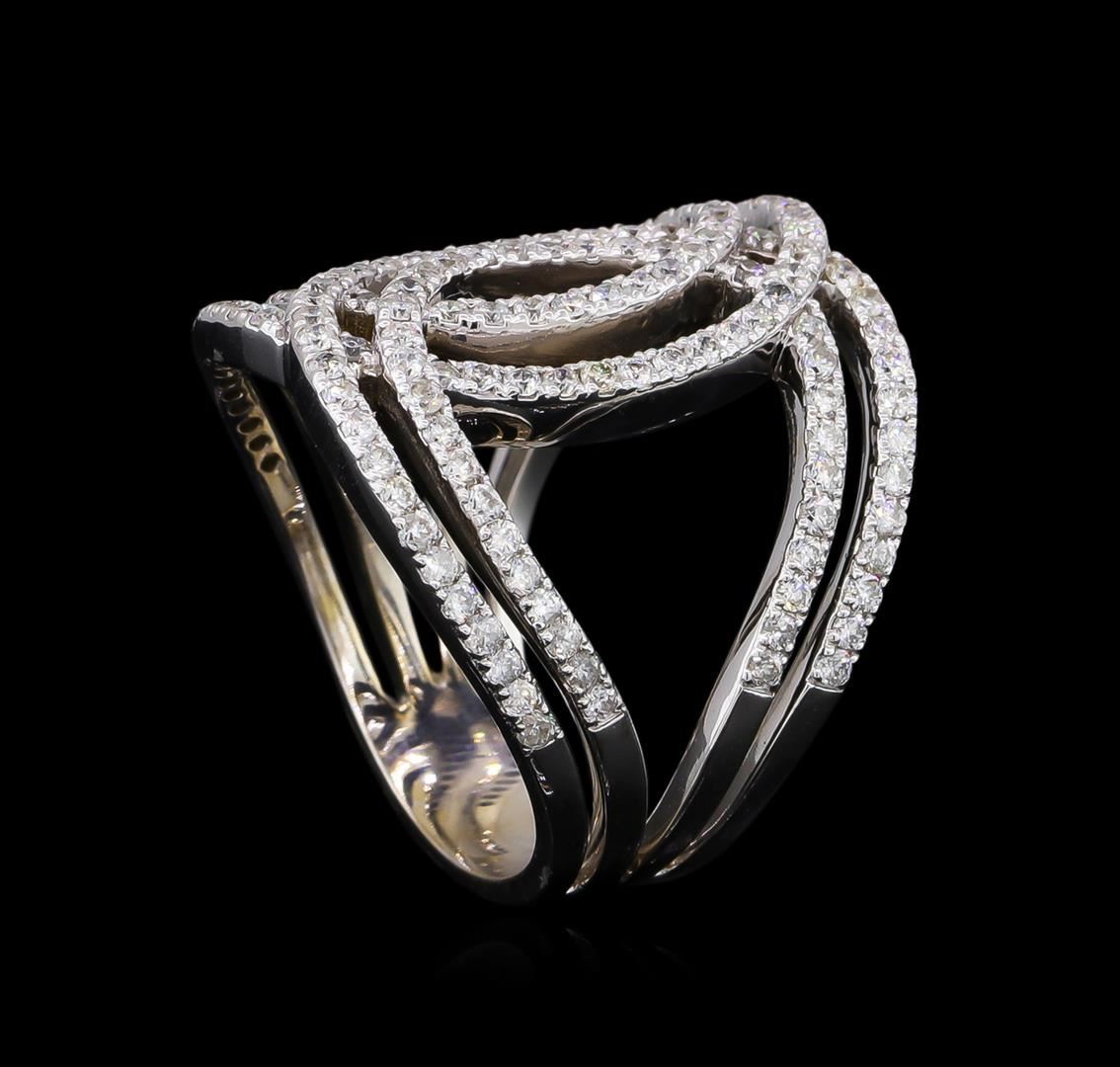 One electronically tested 14KT white gold lady's cast fashion ring with a tapered split shank with a bright polish finish. The featured lady's ring has double wide band interlocking motif and a shank measuring 5.78 millimeters wide. Identified with markings of "585". Condition is new, good workmanship. Containing: One Hundred Forty-Six prong set round brilliant cut diamonds, measuring 1.35 - 1.30 x 0.81mm (depth est.) approximate total weight of 146 Stones = 1.26ct. Graded in the setting. Clarity: SI-1 to I-1. Color: H - I. Cut Good. Total Weight of Diamonds 1.26ct. Total Weight of Ring 8.20gm. GAS Appraised at $5,540.00.