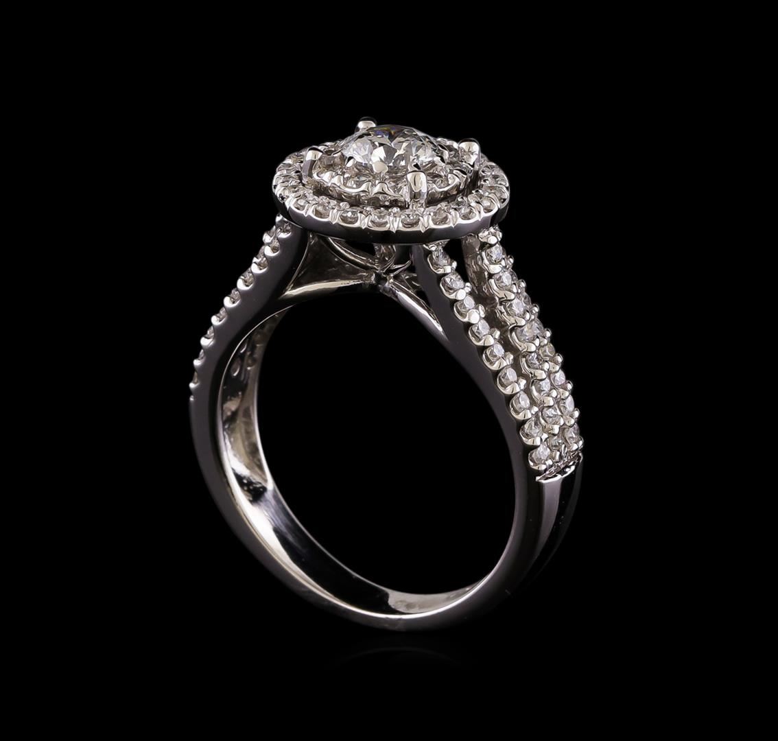 One electronically tested 14KT white gold lady's cast wedding ring with a split shank double halo with a bright polish finish. The featured lady's ring has a shank measuring 3.27 millimeters wide. Identified with markings of '585'. Condition is new, good workmanship. Containing: One prong set round brilliant cut diamond, measuring 5.18 - 5.13 x 3.10mm (depth est.) approximate weight of 0.50ct. Graded in the setting. Clarity SI-2. Color: G - H Cut Good Ten prong set round brilliant cut diamonds, measuring 1.75 - 1.65 x 1.04mm (depth est.) approximate total weight of 10 Stones = 0.18ct. Graded in the setting. Clarity SI-1 to SI-2. Color: H - I Cut Good Seventy-Five prong set round brilliant cut diamonds, measuring 1.30 - 1.25 x 0.79mm (depth est.) approximate total weight of 75 Stones = 0.58ct. Graded in the setting. Clarity SI-1 to I-1. Color: H - I Cut Good. Total Weight of Diamonds 1.26ct.. Total Weight of Ring 5.90gm. GAS Appraised at $6,705.00.
