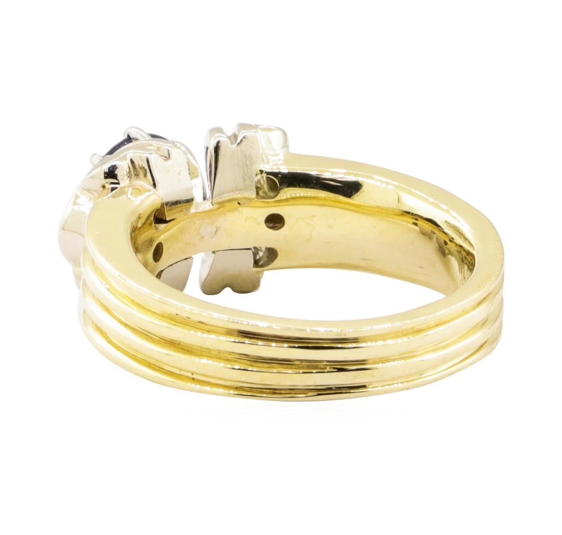 One electronically tested 14KT yellow and white gold lady's combination cast & assembled fashion ring with a scalloped shoulders motif with a bright polish finish. The featured lady's ring has a shank measuring 3.90 millimeters wide. Identified with marki
