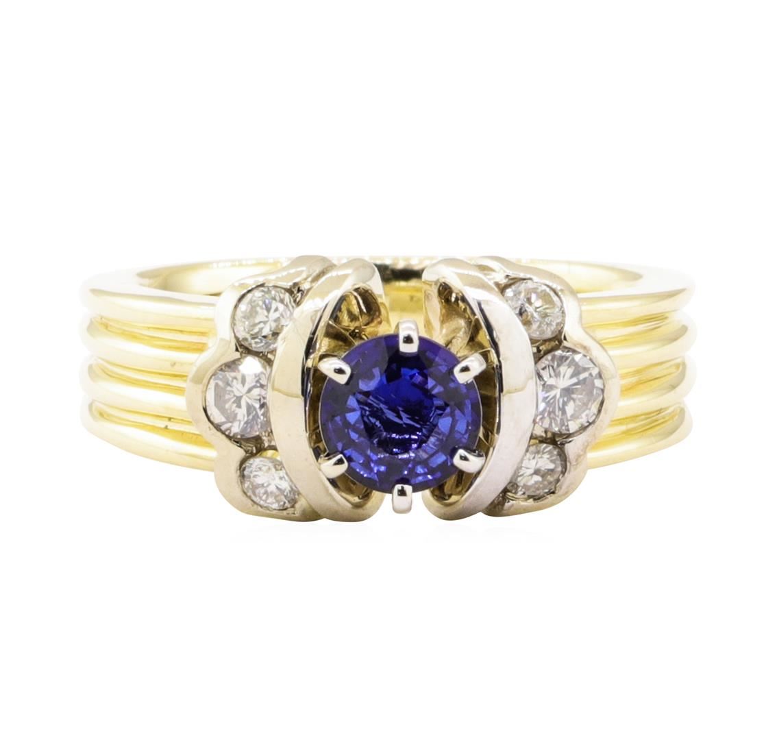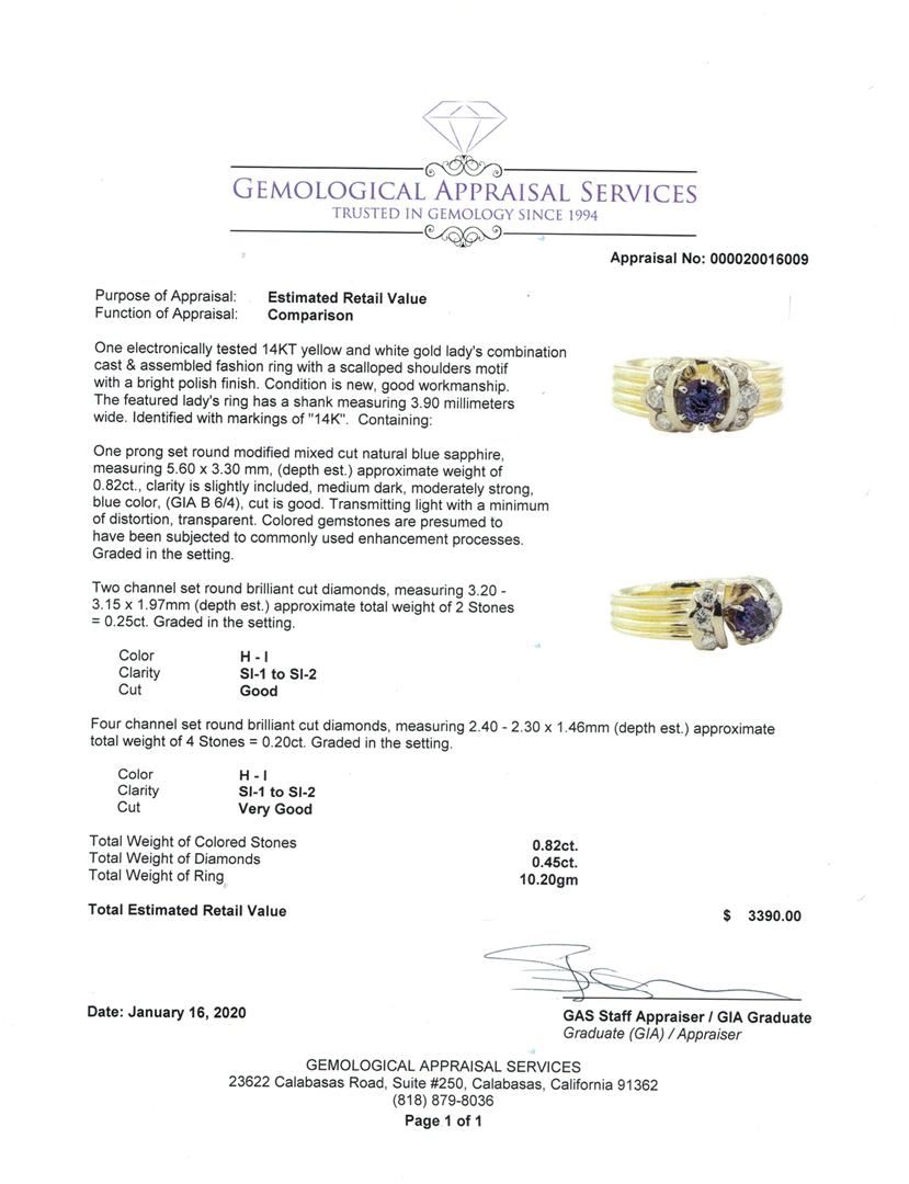 One electronically tested 14KT yellow and white gold lady's combination cast & assembled fashion ring with a scalloped shoulders motif with a bright polish finish. The featured lady's ring has a shank measuring 3.90 millimeters wide. Identified with marki