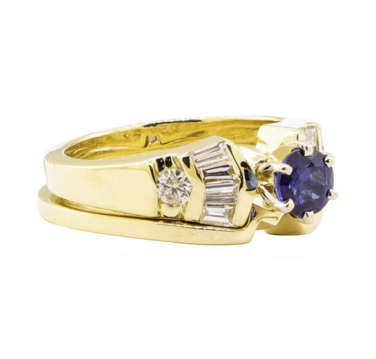 One set electronically tested 14KT yellow gold lady's combination cast & assembled fashion ring and band with a tapered cathedral shank with a bright polish finish. The featured lady's ring set has a double shank measuring 4.20 millimeters wide. Identified with markings of '14K'. Condition is new, good workmanship. Containing: One prong set round modified mixed cut natural blue sapphire, measuring 5.10 - 5.04 x 3.50 mm, (depth est.) 5%. bulge factor, approximate weight of 0.77ct., clarity is eye clean, medium dark, moderately strong, blue color, (GIA B 6/4), cut is good. Transmitting light with no distortion, transparent. Colored gemstones are presumed to have been subjected to commonly used enhancement processes. Graded in the setting. Two channel set round brilliant cut diamonds, measuring 2.90 - 2.85 x 1.79mm (depth est.) approximate total weight of 2 Stones = 0.18ct. Graded in the setting. Color H - I Clarity SI-1 to SI-3 Cut Good Eight channel set baguette cut (tapered) diamonds, measuring from 2.60 x 1.30 x 1.11mm (depth est.) to 2.80 x 1.40 x 1.19mm (depth est.) approximate total weight of 8 Stones = 0.32ct. Graded in the setting. Color H - I Clarity VS-1 to VS-2 Cut Very Good. Total Weight of Colored Stones 0.77ct.. Total Weight of Diamonds 0.50 ct.. Total Weight of Ring And Band 7.90gm GAS Appraised at $3350.00. GAS Appraised.