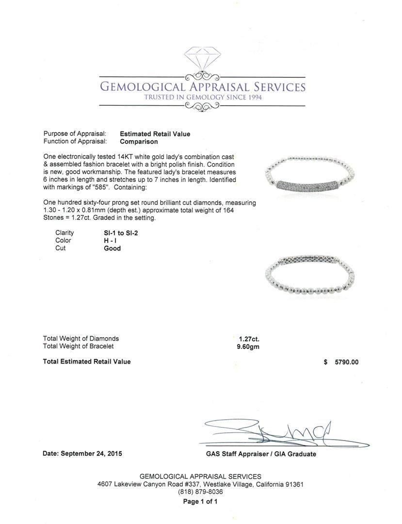 One electronically tested 14KT white gold lady's combination cast & assembled fashion bracelet with a bright polish finish. The featured lady's bracelet measures 6 inches in length and stretches up to 7 inches in length. Identified with markings of "585". Condition is new, good workmanship. Containing: One Hundred Sixty-Four prong set round brilliant cut diamonds, measuring 1.30 - 1.20 x 0.81mm (depth est.) approximate total weight of 164 Stones = 1.27ct. Graded in the setting. Clarity: SI-1 to SI-2. Color: H - I. Cut Good. Total Weight of Diamonds 1.27ct. Total Weight of Bracelet 9.60gm at $5790.00.. GAS Appraised at $5,790.00.