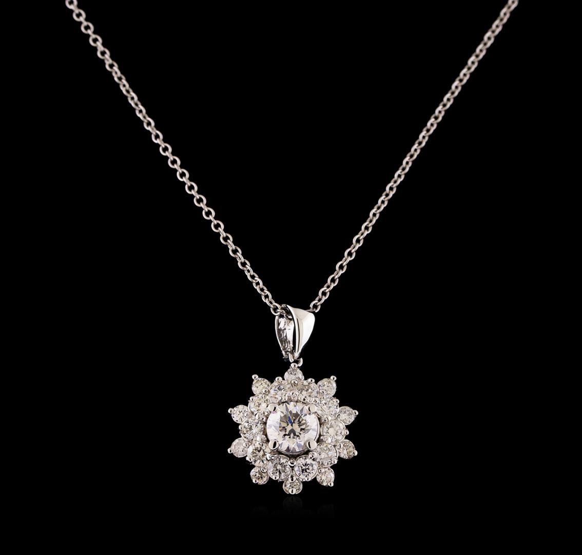 One electronically tested 14KT white gold lady's combination cast & assembled fashion pendant & chain 18.0' long, 1.3mm round cable link with a lobster claw clasp with a bright polish finish. Identified with markings of '14K'. Condition is new, good workmanship. Containing: One prong set round brilliant cut diamond, measuring 5.10 - 5.05 x 3.40mm (depth est.) approximate weight of 0.55ct. Graded in the setting. Clarity VS-2. Color: I - J Cut Good Ten prong set round brilliant cut diamonds, measuring 2.45 - 2.35 x 1.49mm (depth est.) approximate total weight of 10 Stones = 0.52ct. Graded in the setting. Clarity SI-1 to I-1. Color: G - H Cut Good Ten prong set round brilliant cut diamonds, measuring 1.80 - 1.70 x 1.09mm (depth est.) approximate total weight of 10 Stones = 0.20ct. Graded in the setting. Clarity SI-1 to SI-2. Color: H - I Cut Good. Total Weight of Diamonds 1.27ct.. Total Weight of Pendant & Chain 3.90gm. GAS Appraised at $6,230.00.