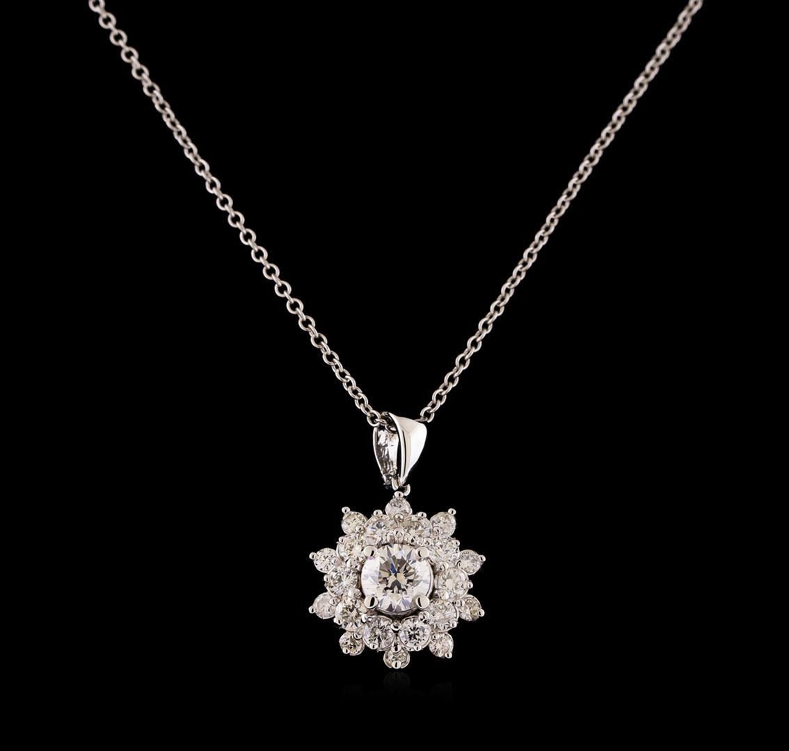 One electronically tested 14KT white gold lady's combination cast & assembled fashion pendant & chain 18.0' long, 1.3mm round cable link with a lobster claw clasp with a bright polish finish. Identified with markings of '14K'. Condition is new, good workmanship. Containing: One prong set round brilliant cut diamond, measuring 5.10 - 5.05 x 3.40mm (depth est.) approximate weight of 0.55ct. Graded in the setting. Clarity VS-2. Color: I - J Cut Good Ten prong set round brilliant cut diamonds, measuring 2.45 - 2.35 x 1.49mm (depth est.) approximate total weight of 10 Stones = 0.52ct. Graded in the setting. Clarity SI-1 to I-1. Color: G - H Cut Good Ten prong set round brilliant cut diamonds, measuring 1.80 - 1.70 x 1.09mm (depth est.) approximate total weight of 10 Stones = 0.20 ct. Graded in the setting. Clarity SI-1 to SI-2. Color: H - I Cut Good. Total Weight of Diamonds 1.27ct.. Total Weight of Pendant & Chain 3.90gm. GAS Appraised.