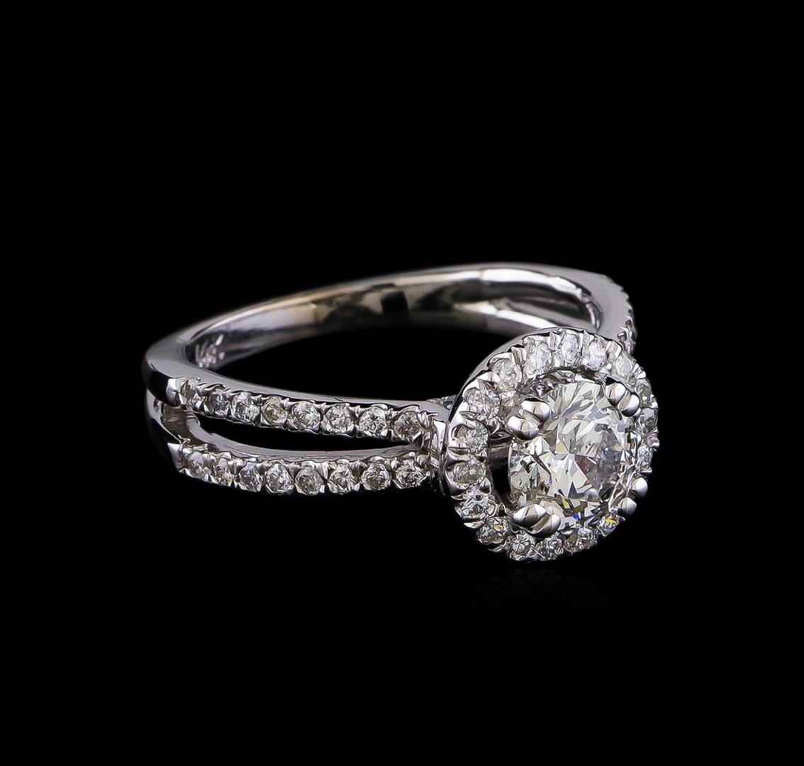 One electronically tested 14KT white gold lady's cast wedding ring with a split shank halo with a bright polish finish. The featured lady's ring has a shank measuring 2.0 millimeters in width. Identified with markings of "14K". Condition is new, good workmanship. Containing: One prong set round brilliant cut diamond, measuring 5.93 - 5.91 x 3.67mm (depth est.) approximate weight of 0.78ct. Graded in the setting. Clarity: SI-3. Color: Good Eighteen prong set round brilliant cut diamonds, measuring 1.40 - 1.30 x 0.84mm (depth est.) approximate total weight of 18 Stones = 0.18ct. Graded in the setting. Clarity: VS-2 to SI-2. Color: G - Good Forty prong set round brilliant cut diamonds, measuring 1.30 - 1.25 x 0.80mm (depth est.) approximate total weight of 40 Stones = 0.31ct. Graded in the setting. Clarity: SI-1 to SI-2. Color: G - I. Cut Good. Total Weight of Diamonds 1.27ct. Total Weight of Ring 3.30gm. GAS Appraised at $9,005.00.
