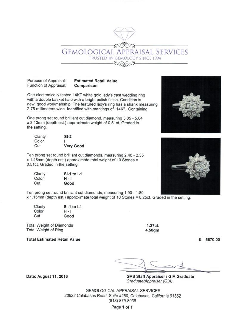 One electronically tested 14KT white gold lady's cast wedding ring with a double basket halo with a bright polish finish. The featured lady's ring has a shank measuring 2.76 millimeters wide. Identified with markings of '14K'. Condition is new, good workmanship. Containing: One prong set round brilliant cut diamond, measuring 5.05 - 5.04 x 3.13mm (depth est.) approximate weight of 0.51ct. Graded in the setting. Clarity SI-2. Color: I Cut Very Good Ten prong set round brilliant cut diamonds, measuring 2.40 - 2.35 x 1.48mm (depth est.) approximate total weight of 10 Stones = 0.51ct. Graded in the setting. Clarity SI-1 to I-1. Color: H - I Cut Good Ten prong set round brilliant cut diamonds, measuring 1.90 - 1.80 x 1.15mm (depth est.) approximate total weight of 10 Stones = 0.25ct. Graded in the setting. Clarity SI-1 to I-1. Color: H - I Cut Good. Total Weight of Diamonds 1.27ct.. Total Weight of Ring 4.50gm. GAS Appraised at $5,670.00.