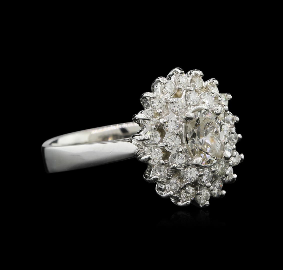 One electronically tested 14KT white gold ladies cast diamond ring with a bright polish finish. The featured diamond is set within stylized diamond floret bezels, completed by a three millimeter wide band. Identified with markings of "K14". Condition is new, good workmanship. Containing: One prong set oval shaped cut diamond, measuring 5.90 x 4.50 x 3.00mm (depth est.), 8.00.%. GTCF approximate weight of 0.65ct. Graded in the setting. Clarity I-2 Color J. Depth 66.7%. Table 57.8%. Thirty prong set round brilliant cut diamonds (depth est.) approximate total weight of 30 Stones = 0.62ct. Graded in the setting. Clarity I-1 to I-2 Color G - I. Total Weight of Diamonds 1.27ct. Total Weight of Ring 6.08 grams. AIG Appraised at $4,120.00.